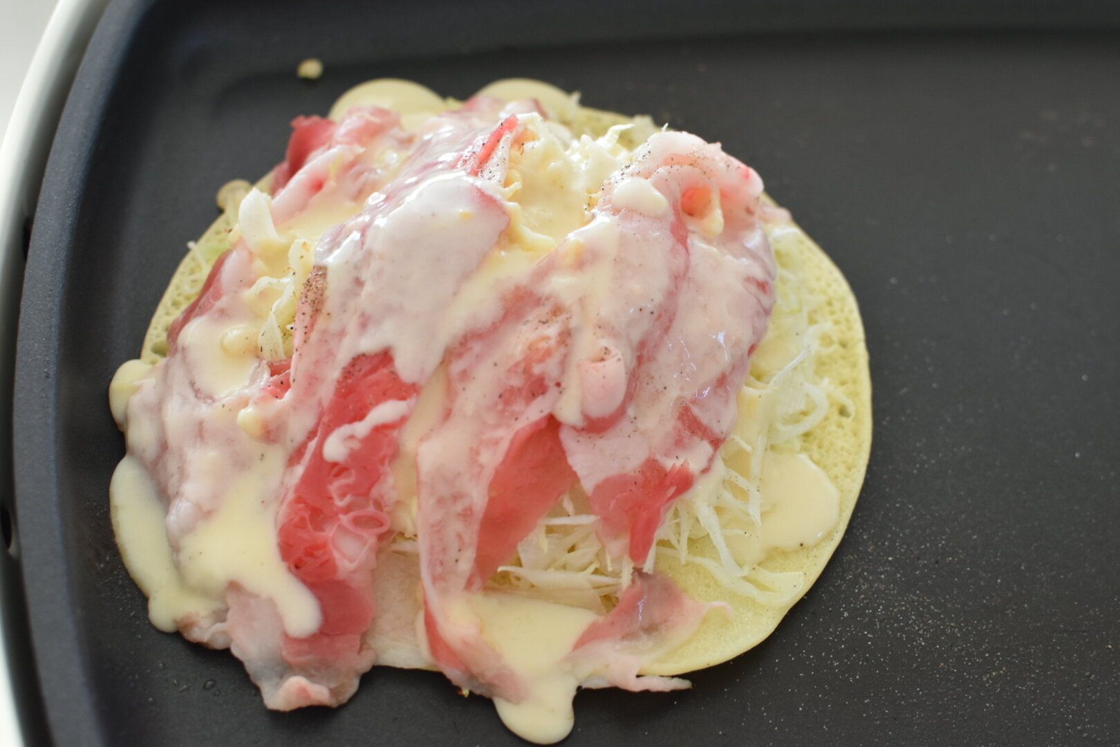 生地を薄く伸びしていきます。片面が焼けたらキャベツをたっぷり乗せていきます。