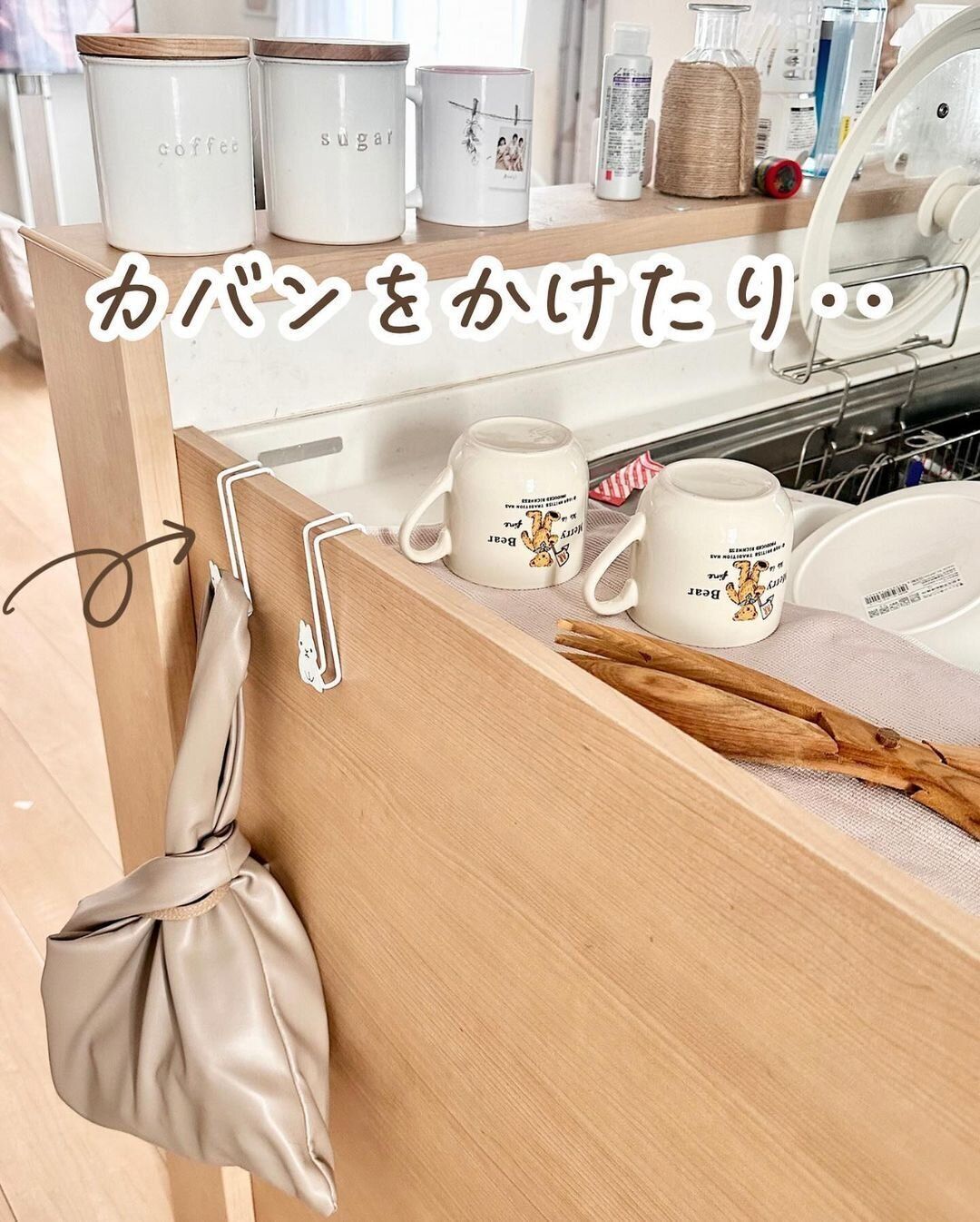 ほかにも、床に置きっぱなしになりがちな軽いカバンなどもかけることができます。ただし、耐荷重は1kgですので、ご使用の際は、重さにもお気をつけくださいね!