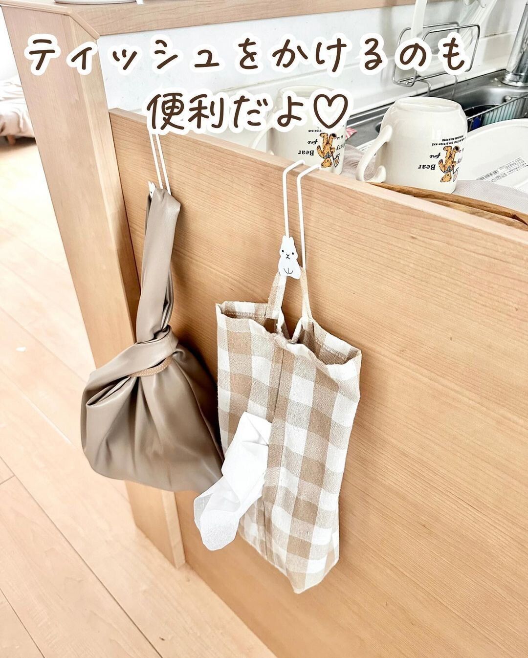 そして、意外と困るのが、ティッシュの置き場ですよね。かさばるだけでなく、家族全員が届く場所にも置いておきたいもの。そんなときは、ティッシュケースに入れてこのフックにかければ、浮かせる収納が可能に。アイデア次第で、さまざまなものをいろいろな場所にかけられるので、ぜひ試してみては。