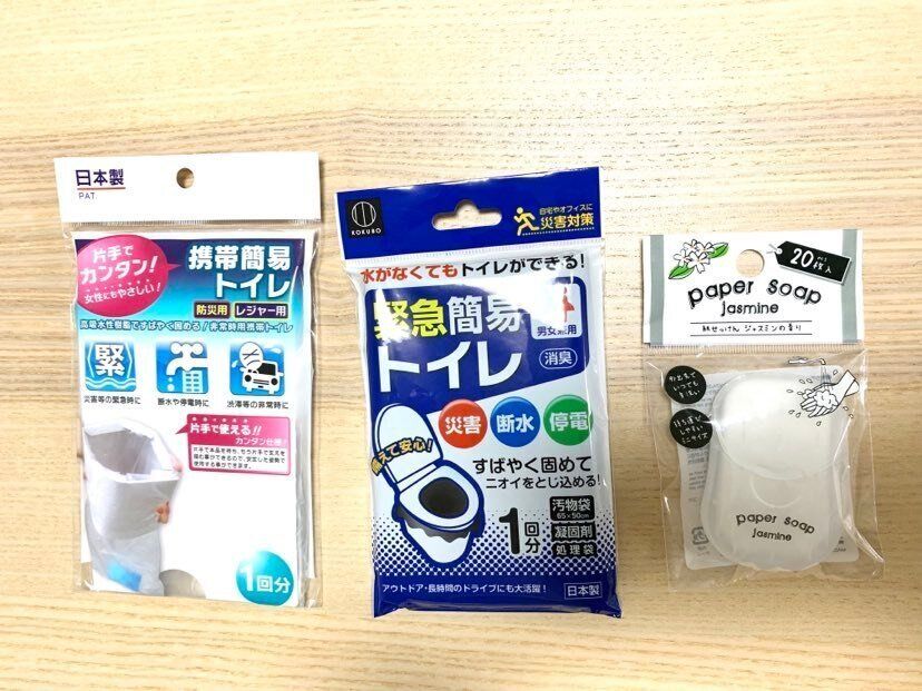 簡易用のトイレや石鹸は多めに用意しました。