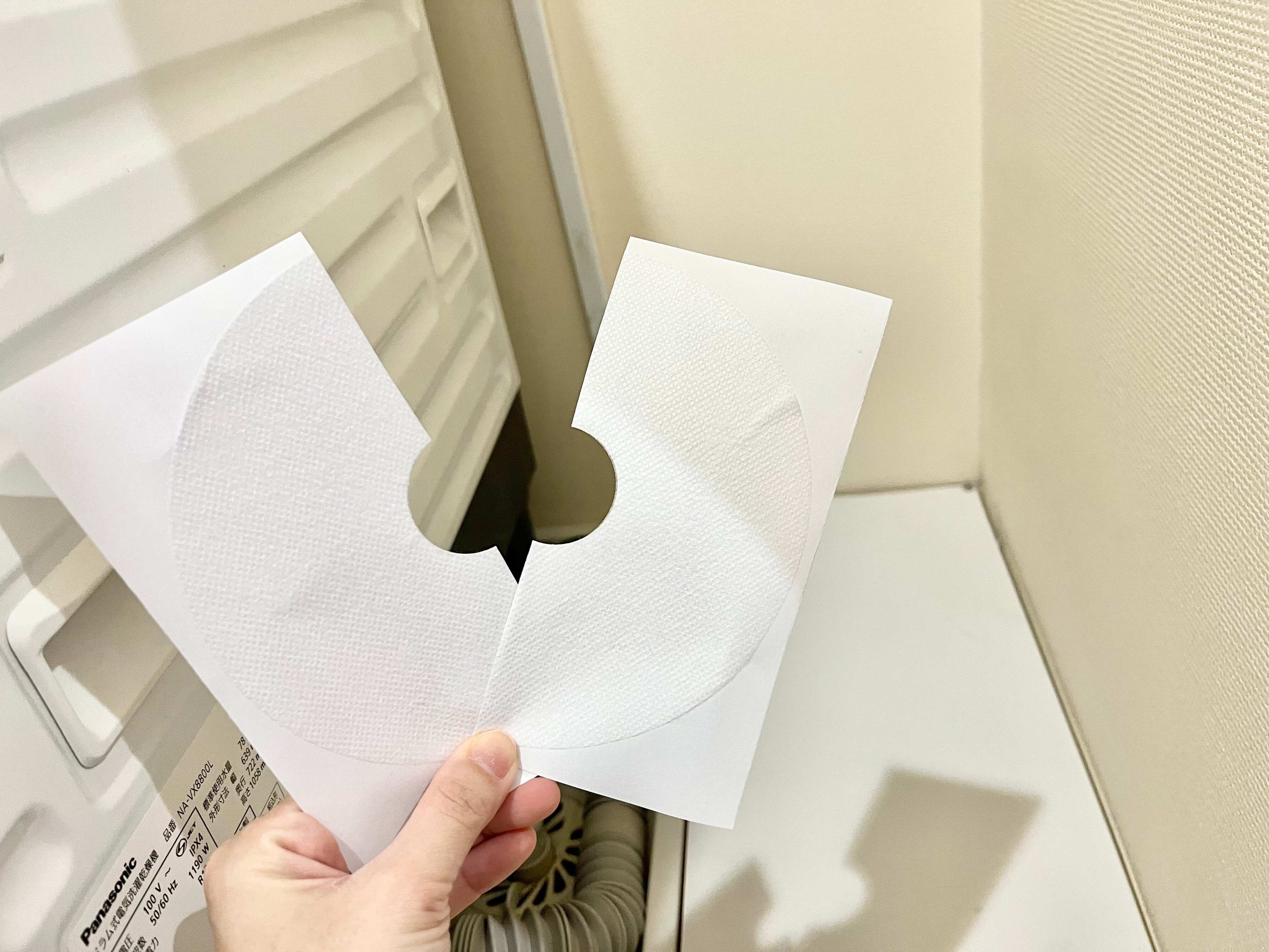 使い方は、まずあらかじめ排水口カバーのまわりの埃やゴミをきれいに取り除きます。そして、剥離紙を剥がしてからフィルターの切れ込みを広げて、ホースのまわりを囲うように貼りつけたら完成です。
