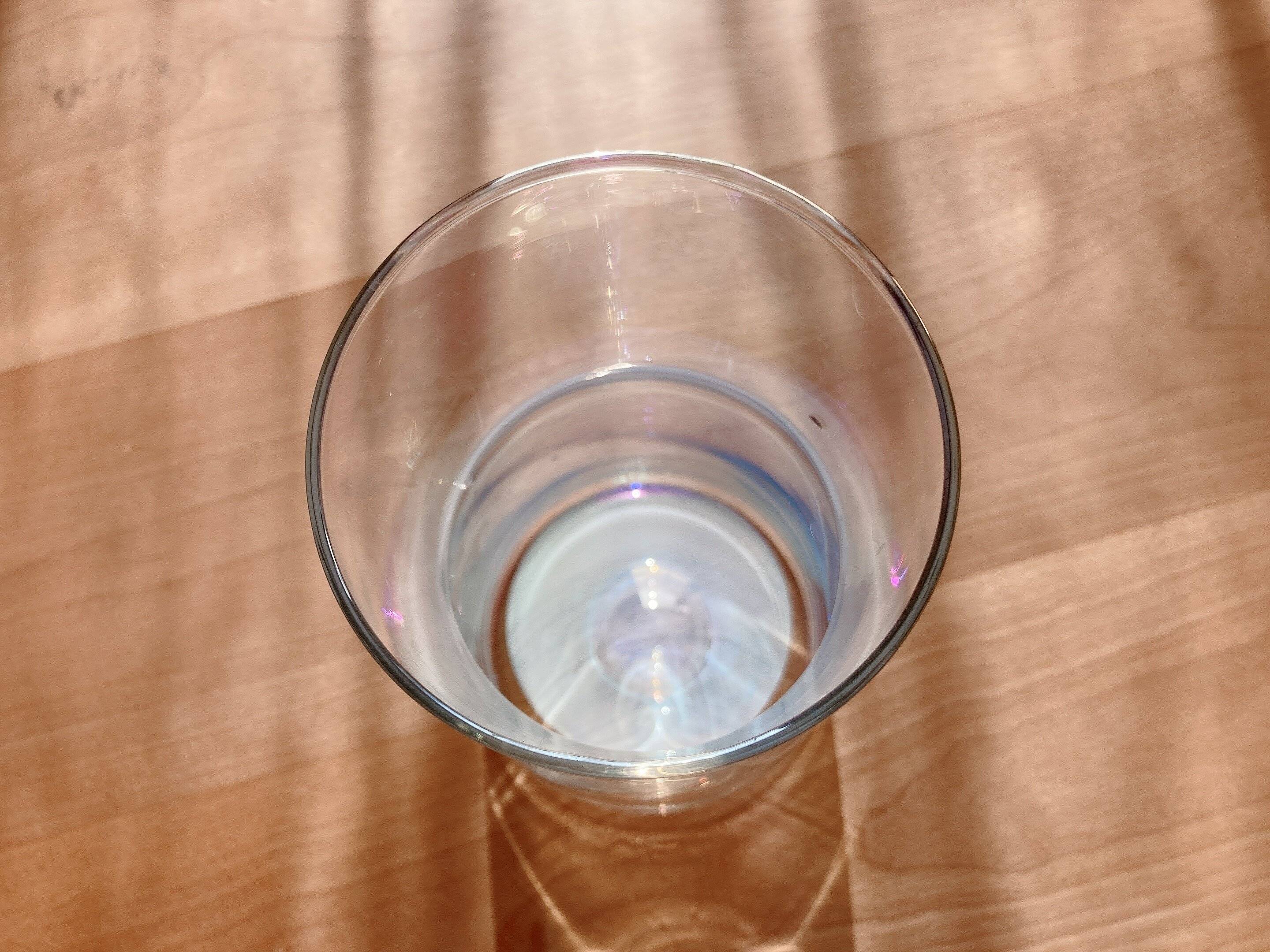 ガラス製で安定感のある丸いフォルムのフラワーベース。なんとこちら見る角度によってオーロラのようにキラキラ光るんです。とても220円には見えないですよね!