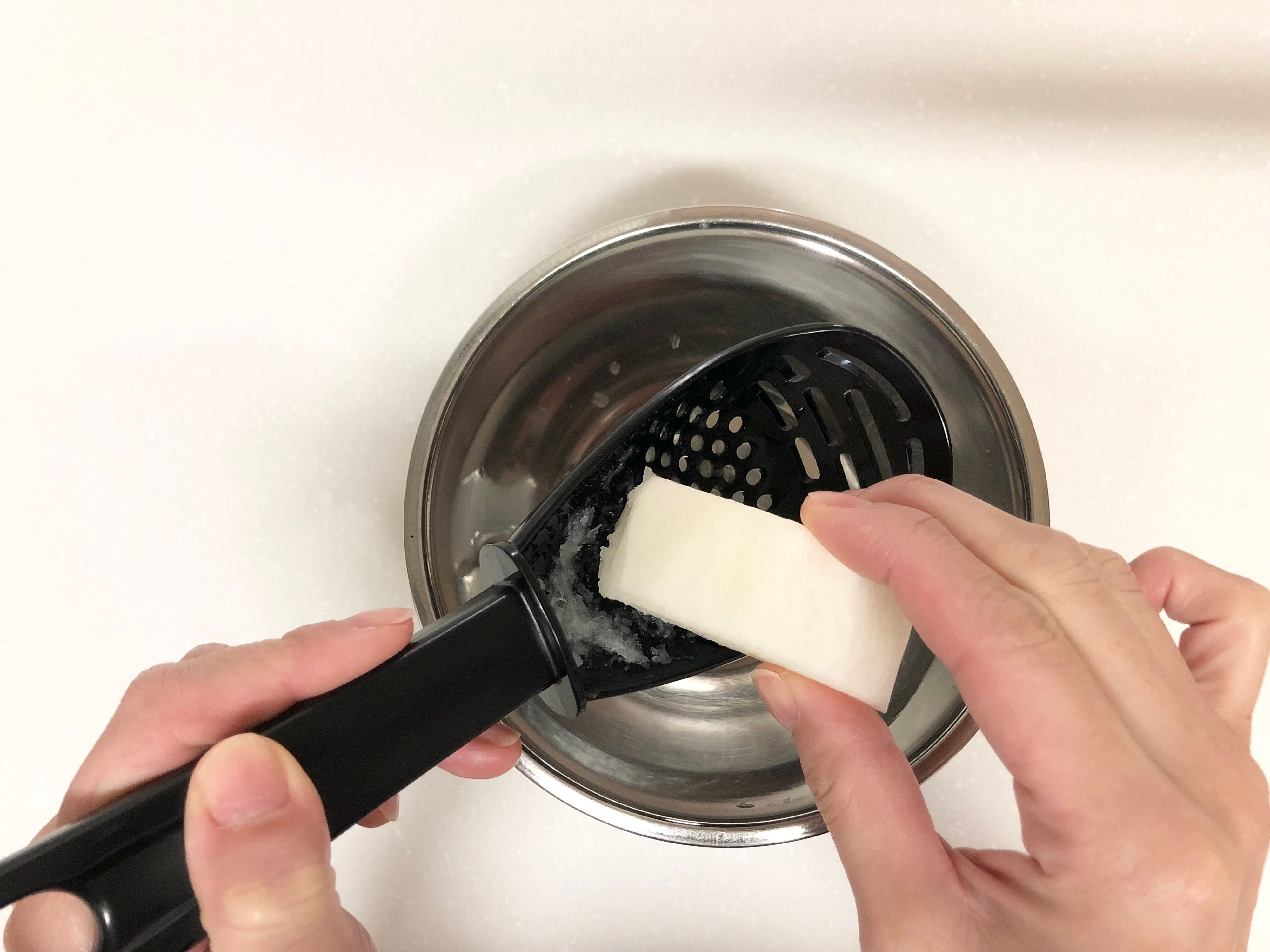 すりおろした大根を、「万能調理スプーン」の穴のある場所に移動させると、余分な水分も切ることもできて便利!たくさんの量をすりおろしたいときには、このサイズだと少し大変かもしれませんが、生姜やわさびなど、少しだけすりおろしたいときには最適です。