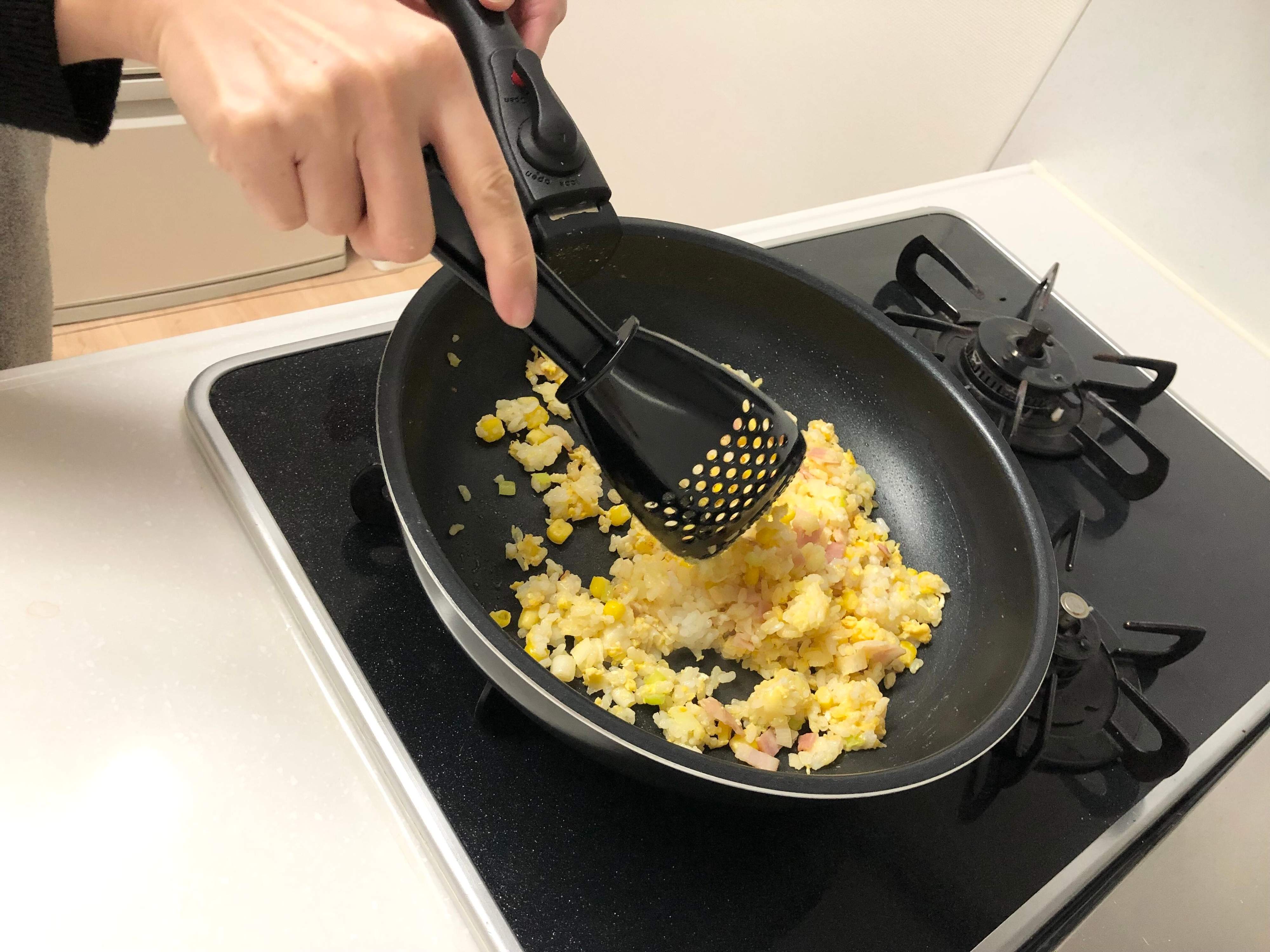 最後はフライパンで、炒飯をつくってみました。素材がナイロンなので、フライパンや鍋などに傷をつけにくく、耐熱温度は220℃なので、火を使った炒め料理でも安心して使用できます。