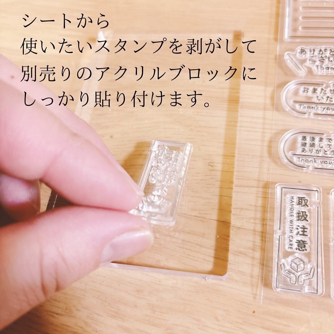 注意点は使用する際に、別売りのアクリルブロックに貼り付けて使うこと。アクリルスタンプ単体では使用できないので、初めて購入する際は一緒に「アクリルブロック(スタンプ用、中)」110円を購入することを忘れないようにしましょう!