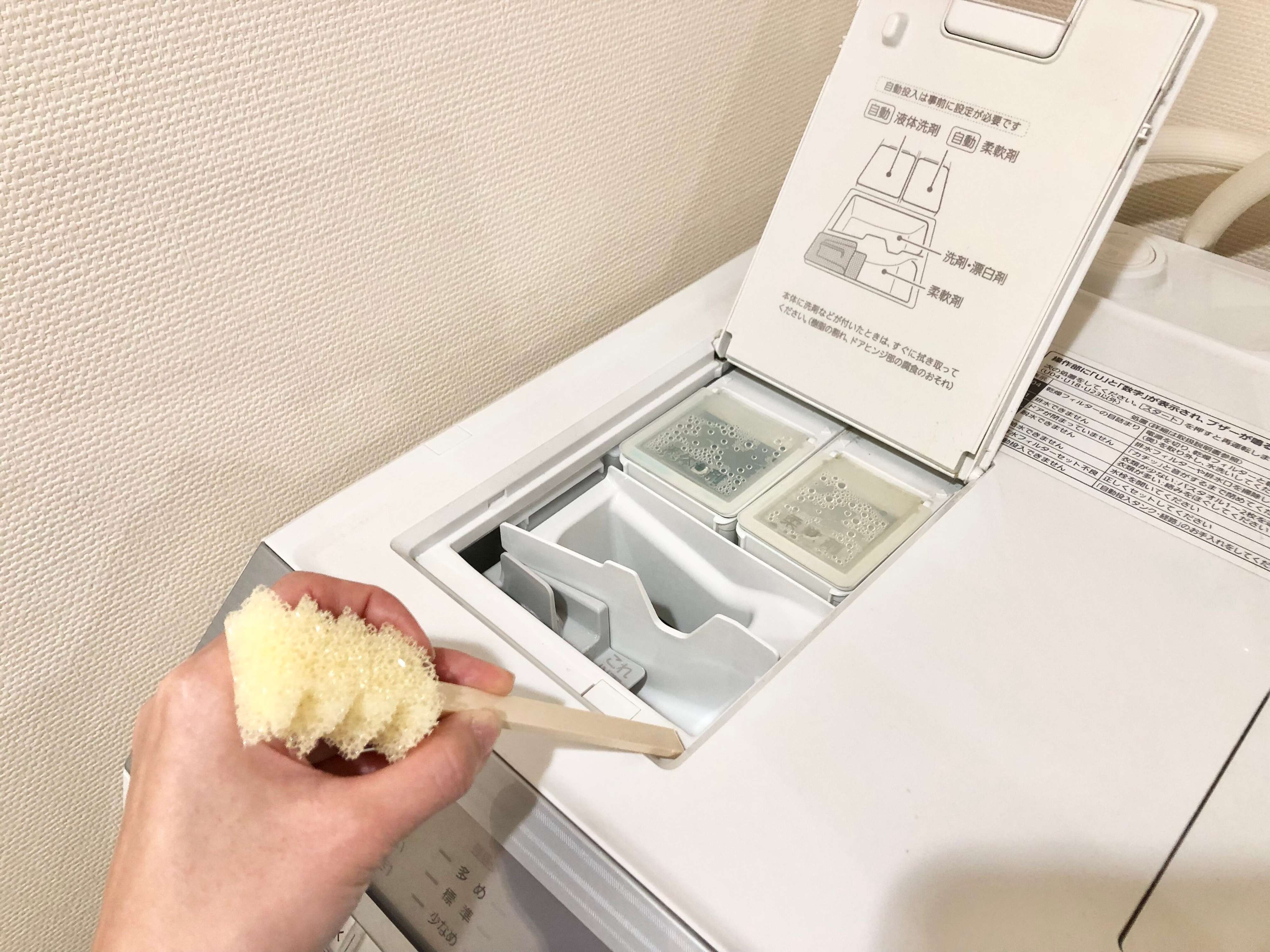 洗剤投入口って、カピカピになった洗剤の塊が残りがちですよね?でもスクレーパーを使用すれば、こびり付いた汚れをキレイに掻きとることができます。