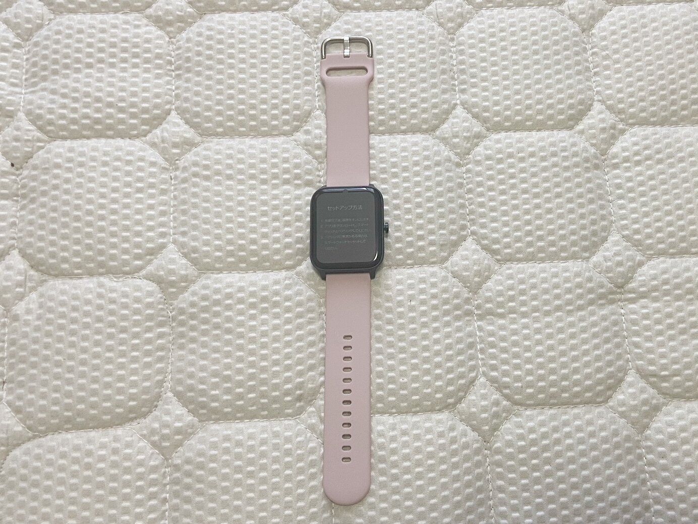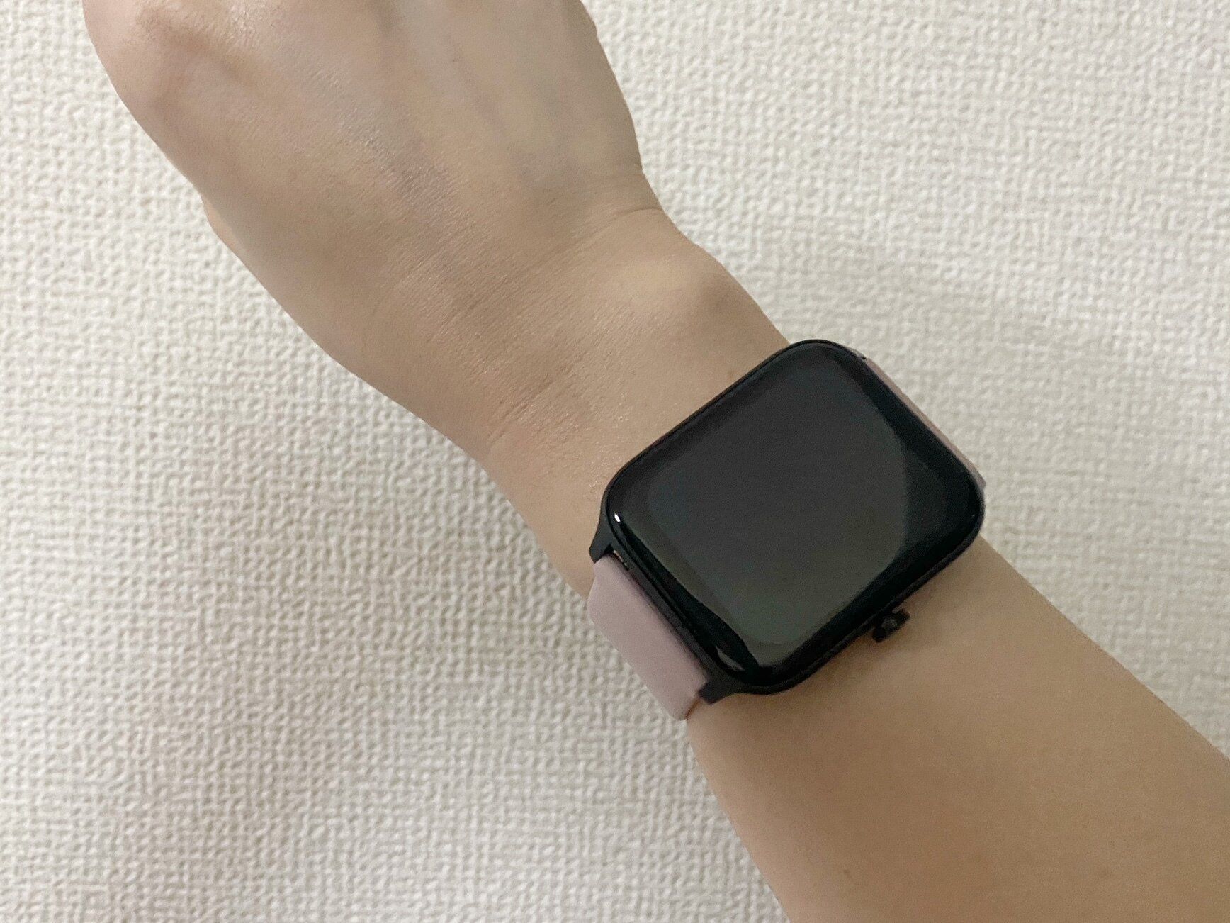 筆者はピンクを購入したのですが、くすみピンクなのでアラフォーでも身につけやすい印象です。ハンサムな印象のスマートウォッチですが、ベルトがピンクだとガーリーなファッションにもピッタリですよね。