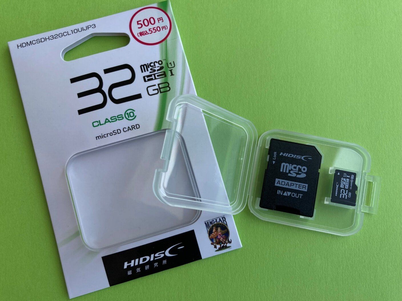 容量は32GBと少なめですが、class10という規格に対応していてそこそこ早く読み書きできます。本体はmicroSDという小型サイズのカードですが、SDカードの変換アダプターも付属しています。