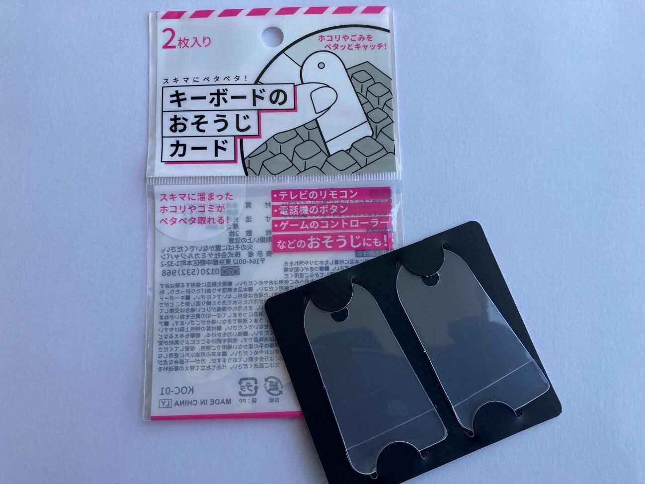 キーボードのおそうじカードは、先端部が粘着シートになっているので、キーボードやボタンの隙間に入ったホコリをペタペタ取ってくれる商品です。