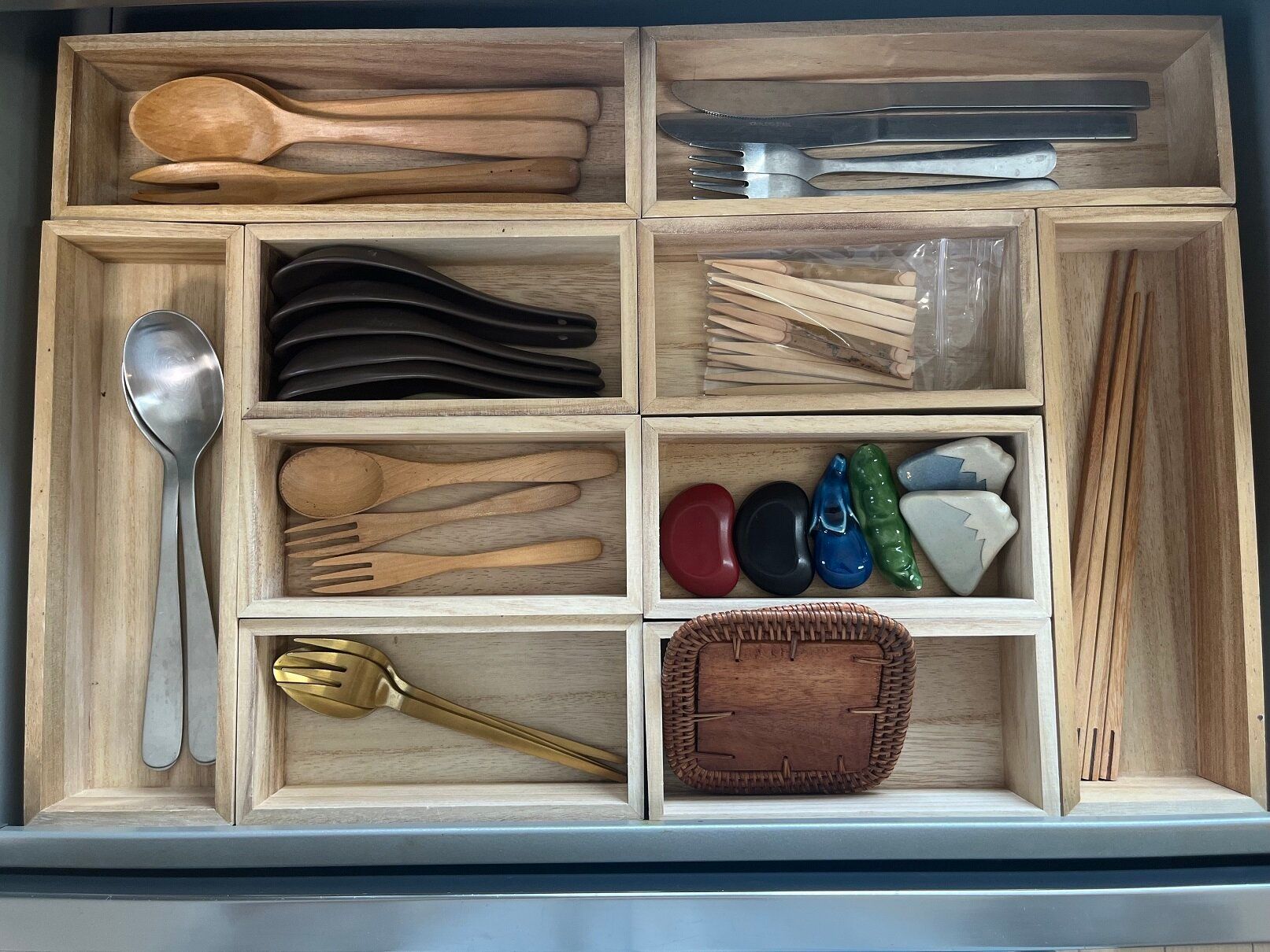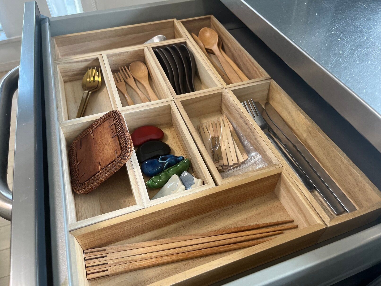 一体型のカトラリーボックスもいいですが、この商品なら自分の引き出しのサイズや使い方に合わせていろいろと組み合わせることができて便利です。