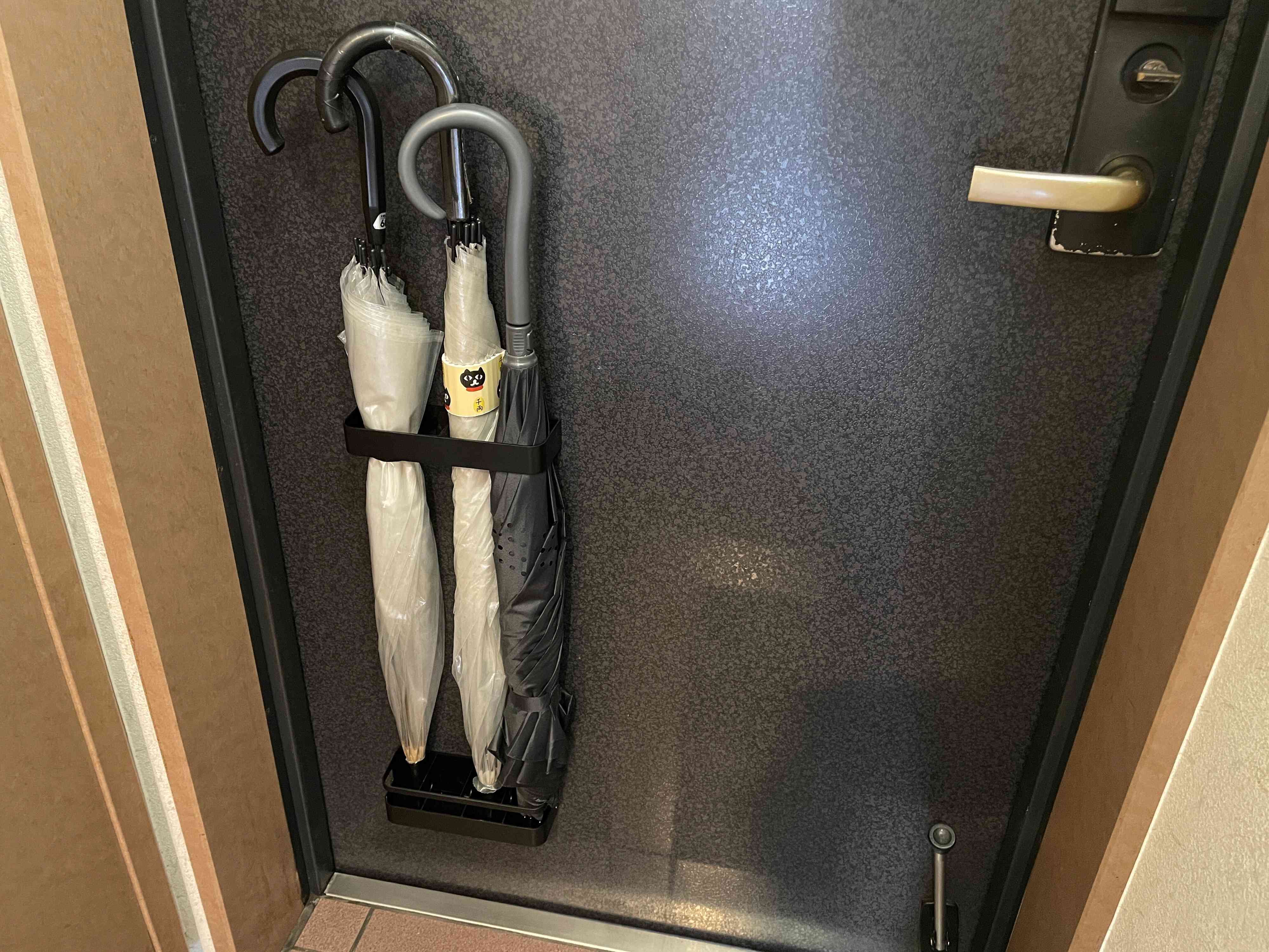 玄関に傘たてを置くスペースがなくても、ドアに貼りつければ傘たてが誕生!