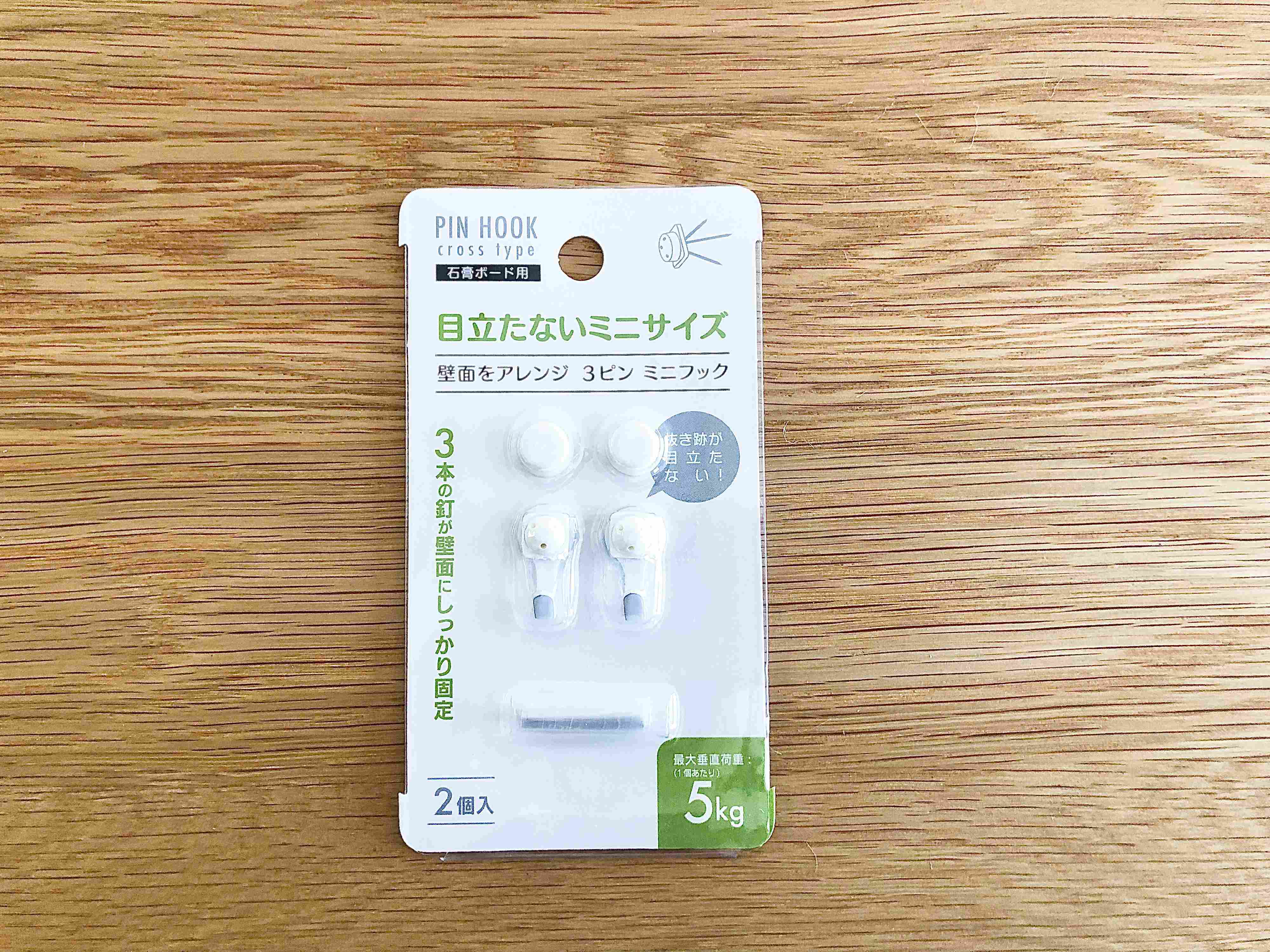 セリアの超優秀アイテム、『壁面をアレンジ 3ピン ミニフック』。石膏ボード用なので、下地が入ってない壁にでも手軽に取りつけられる便利なフックです。