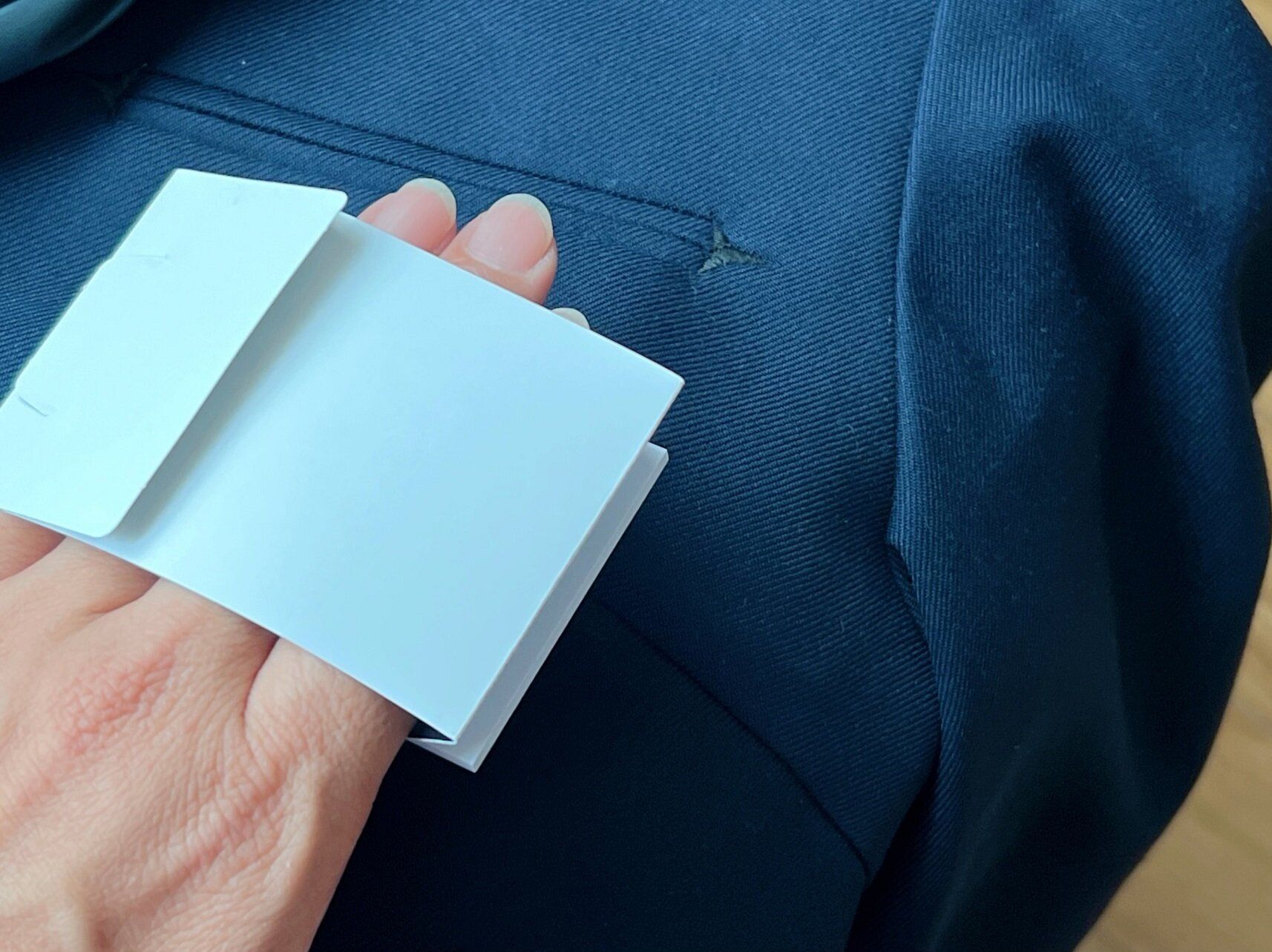 黒っぽい洋服やスーツを着たときは少しのほこりでも気になってしまいますね。家を出るときはキレイだったのに、外出中にほこりがついてしまうこともあります。そんなとき、この「身だしなみふせん」がほこりやゴミをしっかりキャッチしてくれます!