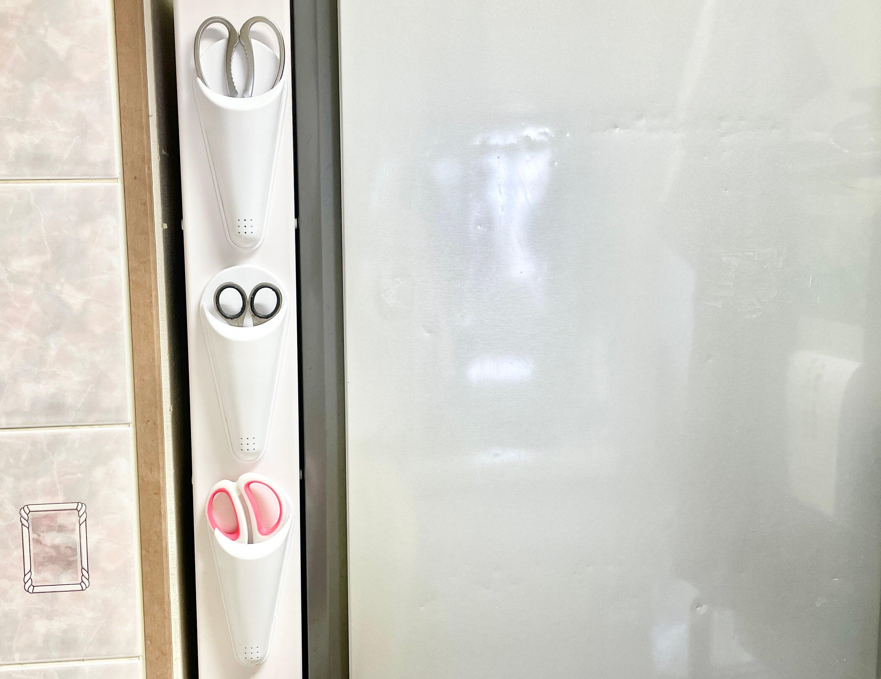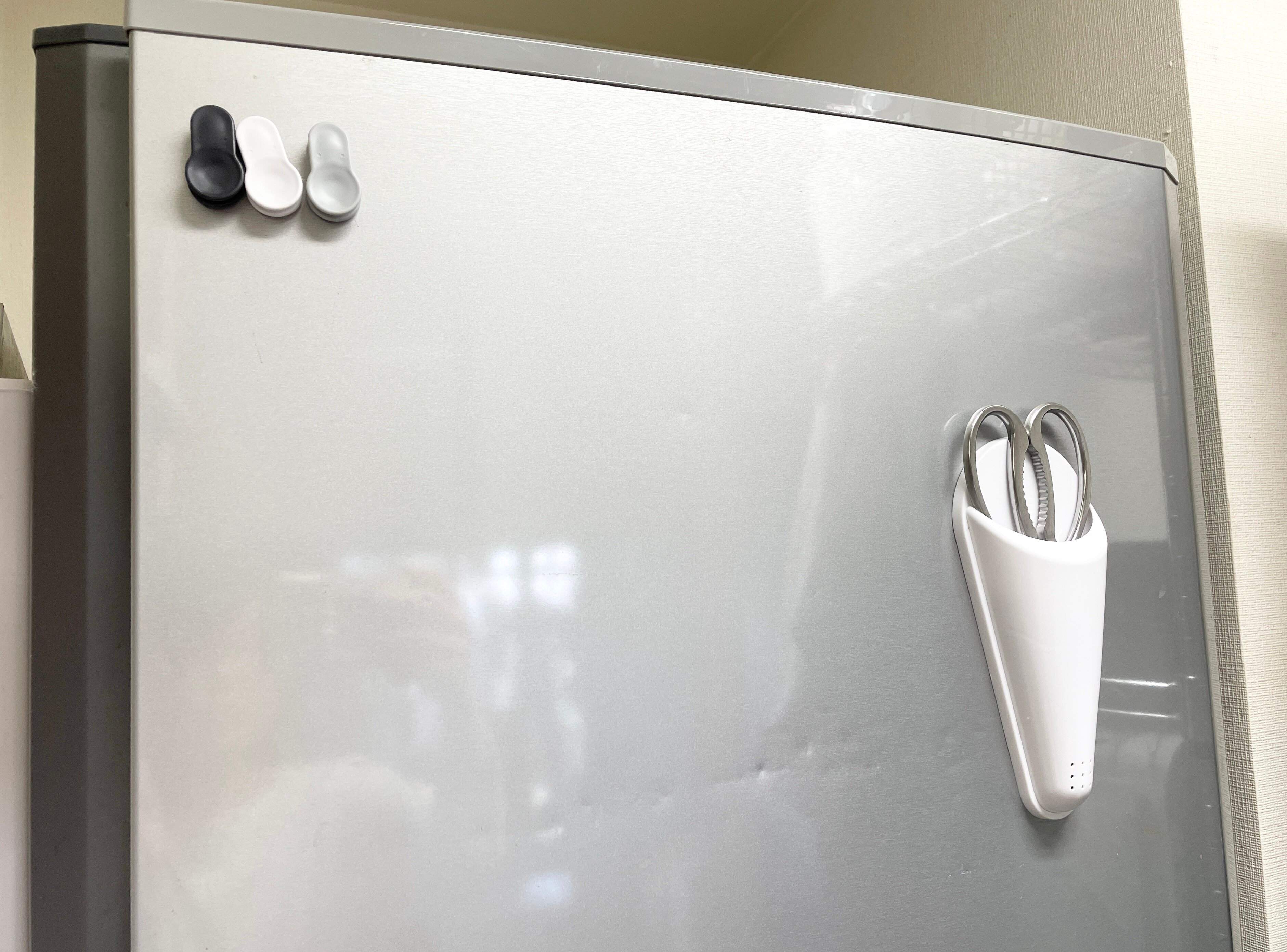 わが家では、冷蔵庫横の収納棚に3つを貼り付け、キンチンハサミ、普通のハサミ、分別ハサミを縦に並べています。