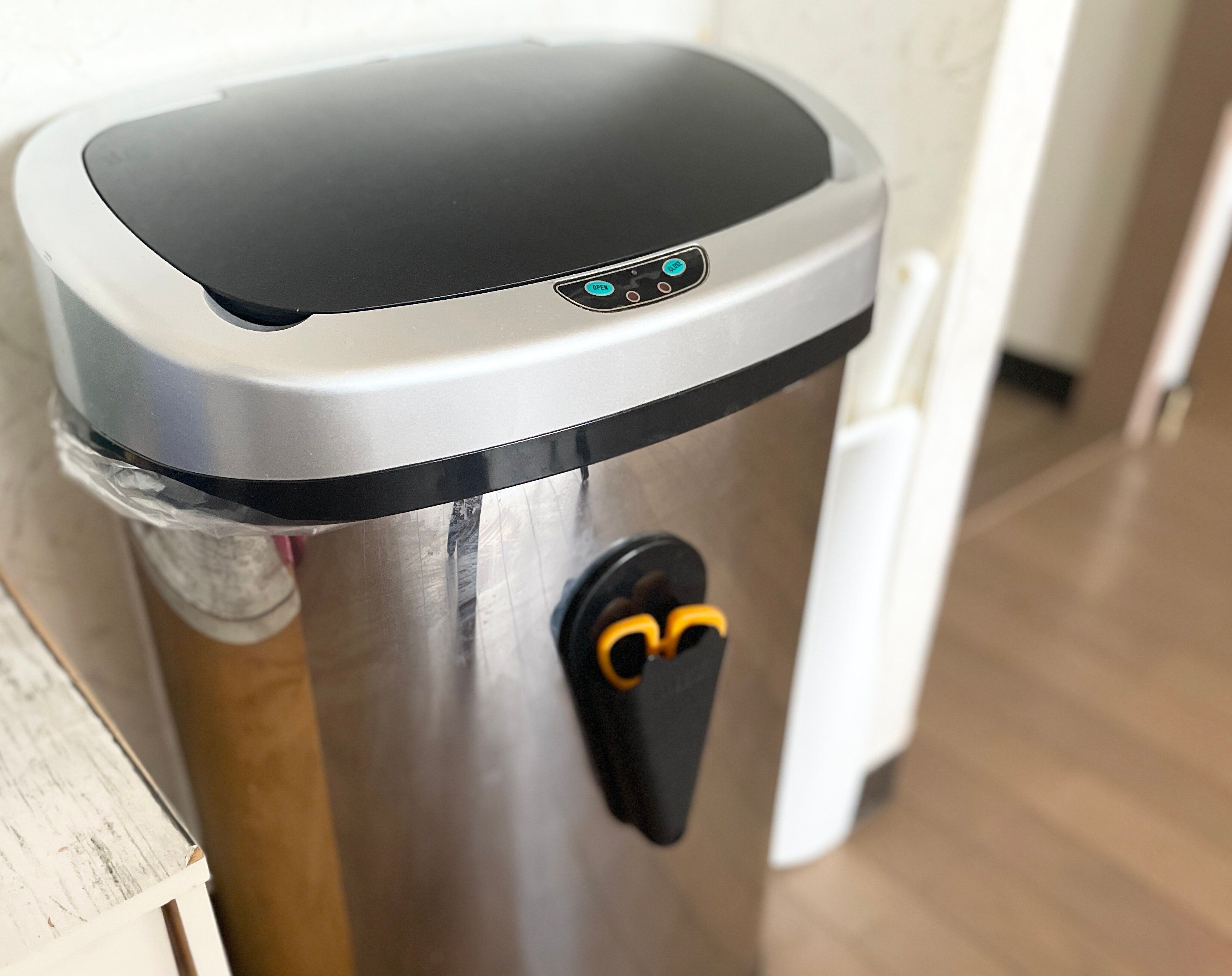 おすすめはゴミ箱に貼ること。我が家では、黒い猫型デザインのハサミホルダーをゴミ箱に貼っています。