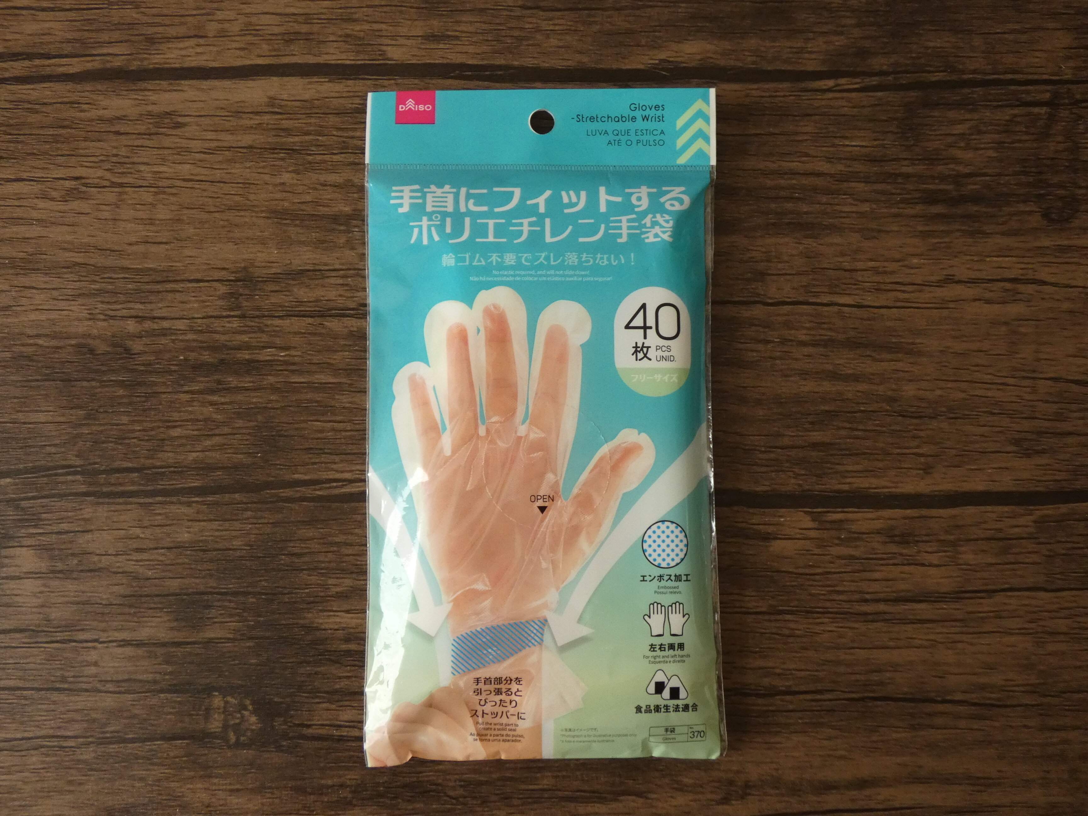ダイソー「手首にフィットするポリエチレン手袋」は40枚入り110円。