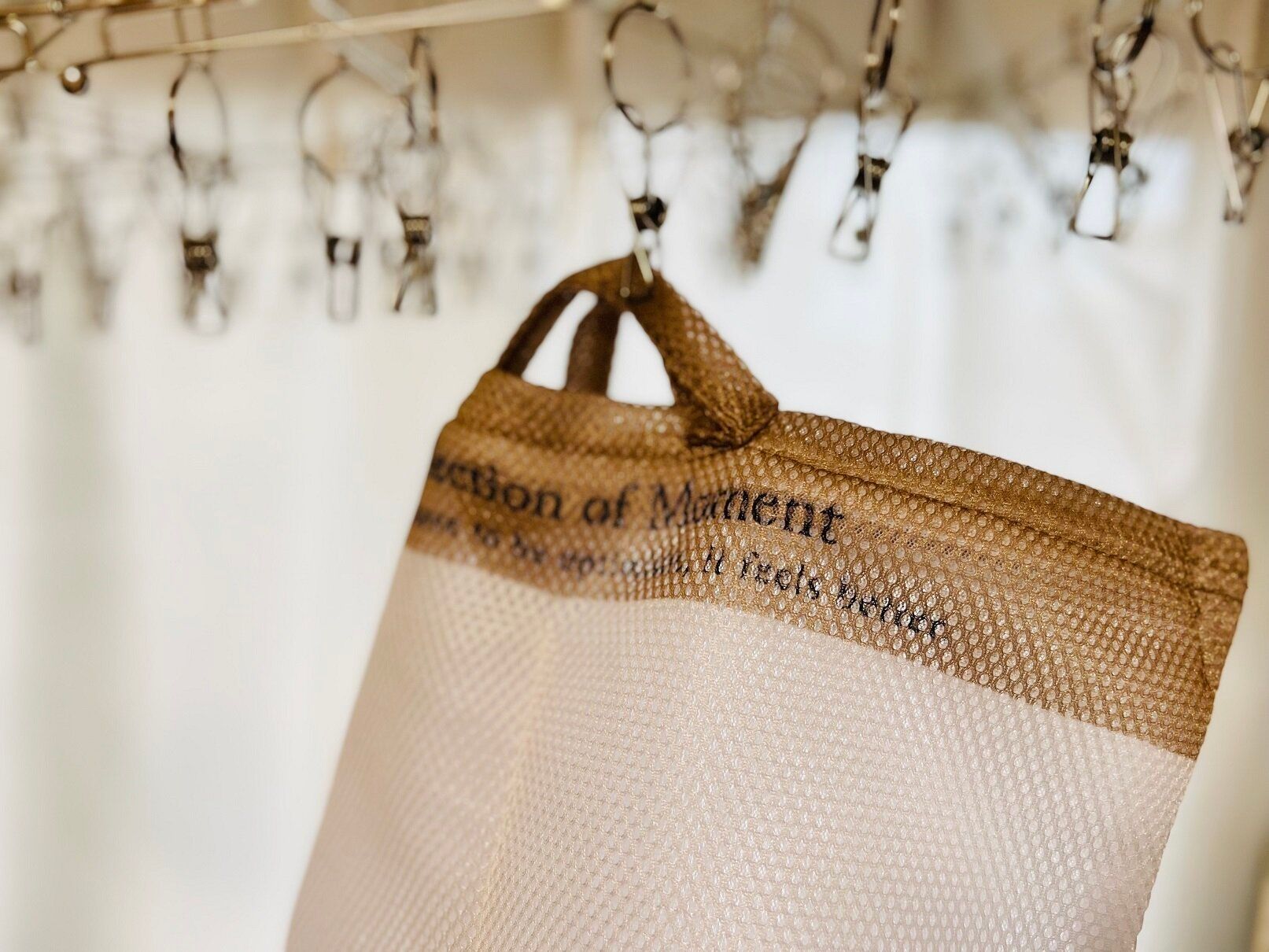 洗濯ネットは掛けられるので、干す時もラクに中身を取り出せます。干し終わったらそのまま洗濯バサミに挟んで乾かせます。抗菌防臭とスピード乾燥機能付きなので臭いにくく乾きやすいです。