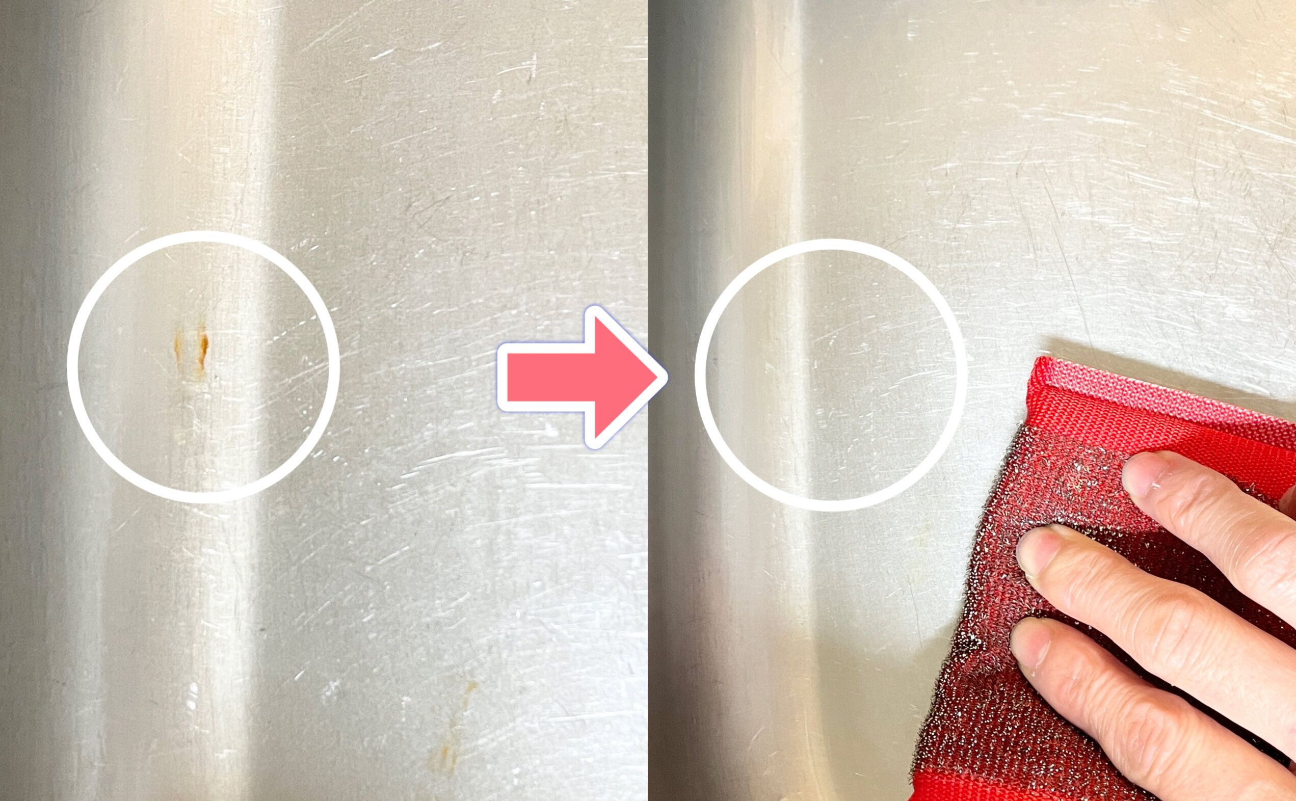 表面は細かいステンレス繊維だから、汚れをからめとってくれてよく落としてくれます。だから、水アカなどの汚れが水だけでも落とせます。