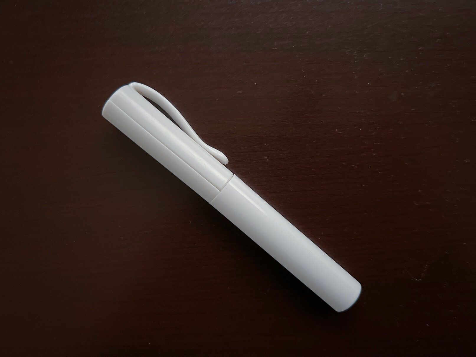 価格は110円で、ホワイト、パープル、ピンク、グレーの4色展開のコンパクトハサミ。見た目はどう見てもペンです。