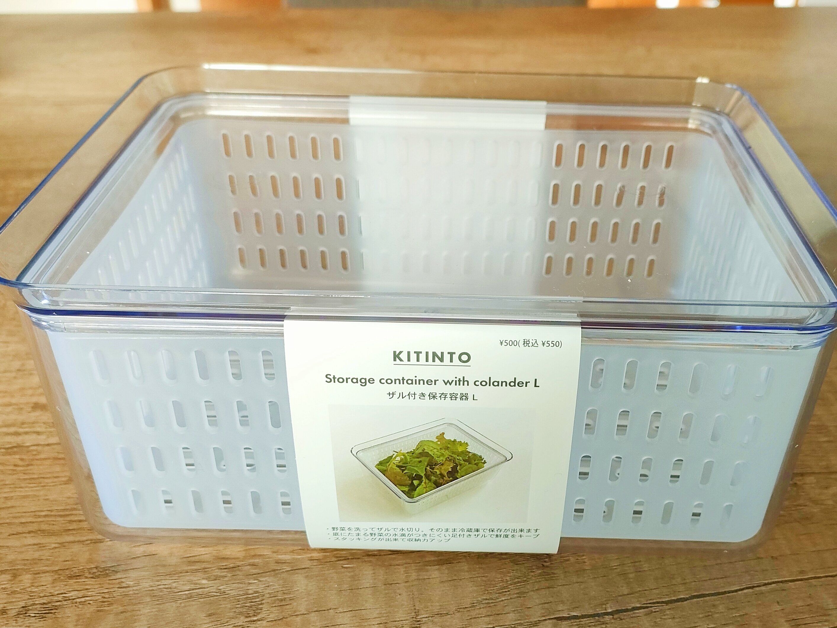 今回ご紹介すするのは3COINSでおなじみのKITINTOシリーズの「ザル付き保存容器L」550円です。Mサイズもあり、そちらは330円となっています。