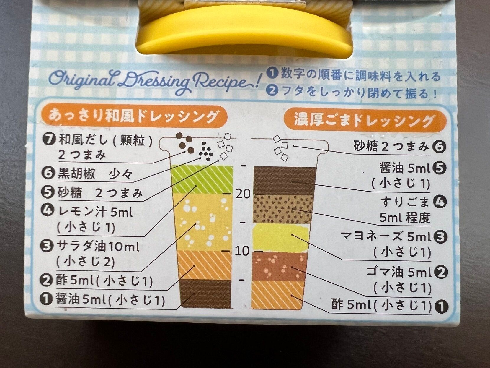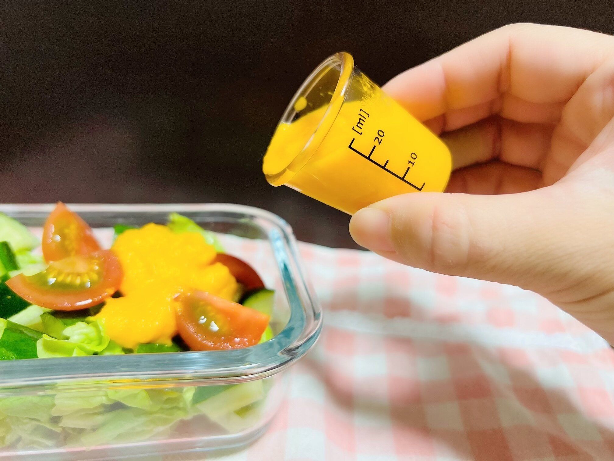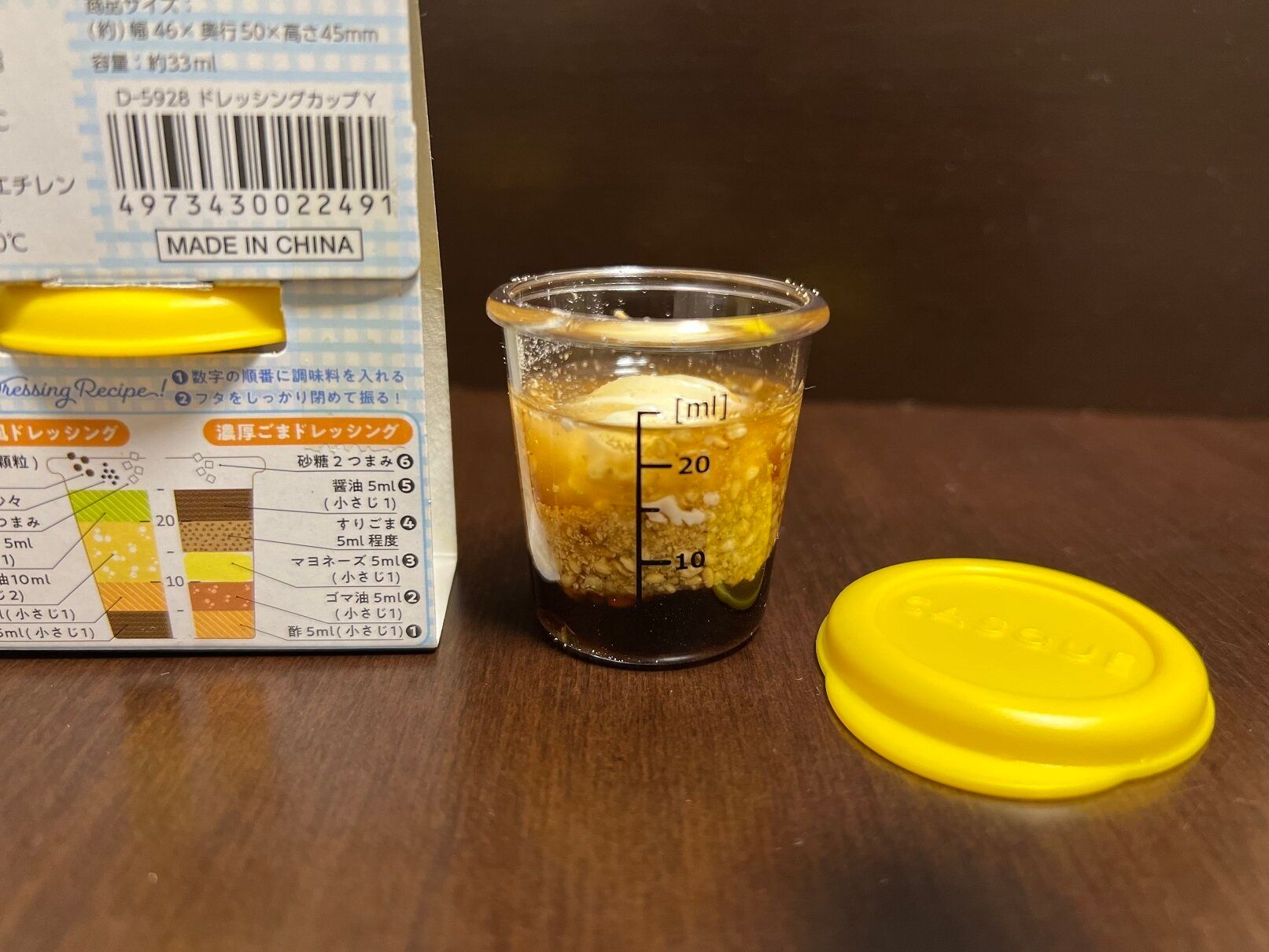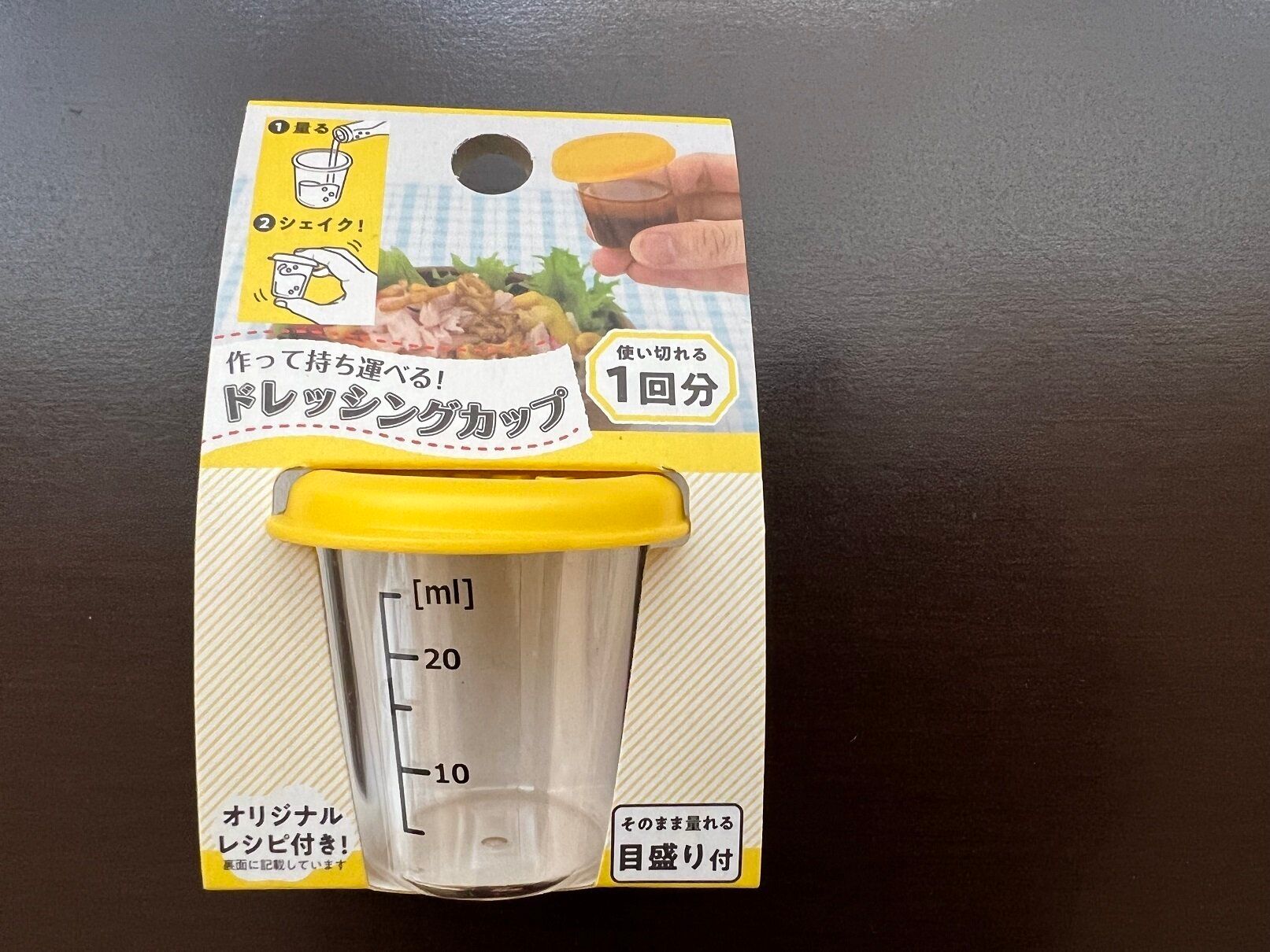 ダイソーの「ドレッシングカップ」はこれひとつでドレッシングを量って、混ぜて、持ち運べる便利なアイテムです。