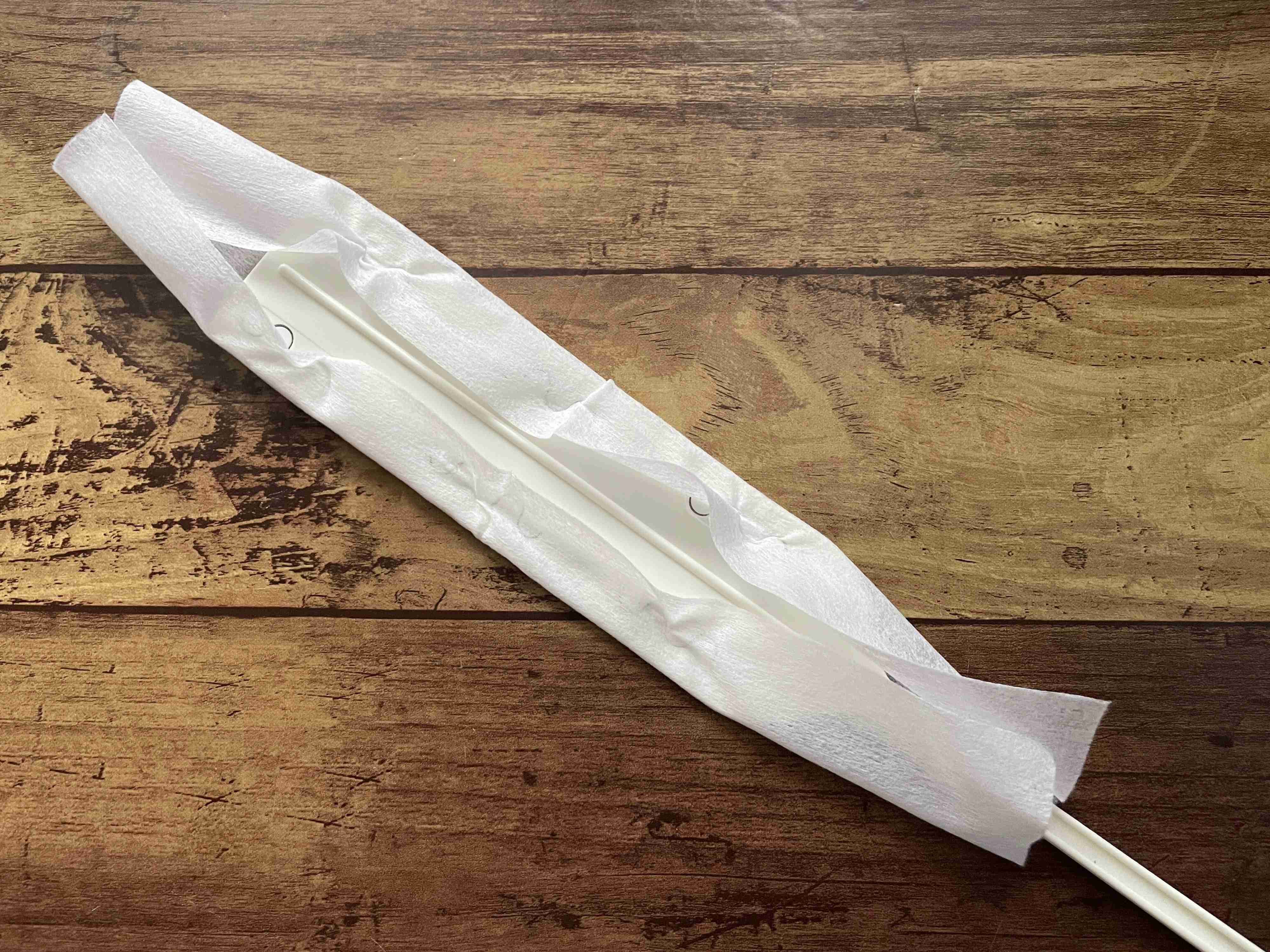 市販のフローリングワイパー用シートを縦半分に切ればちょうどいい大きさに。差込口に挟み込むだけですから、装着も簡単です。