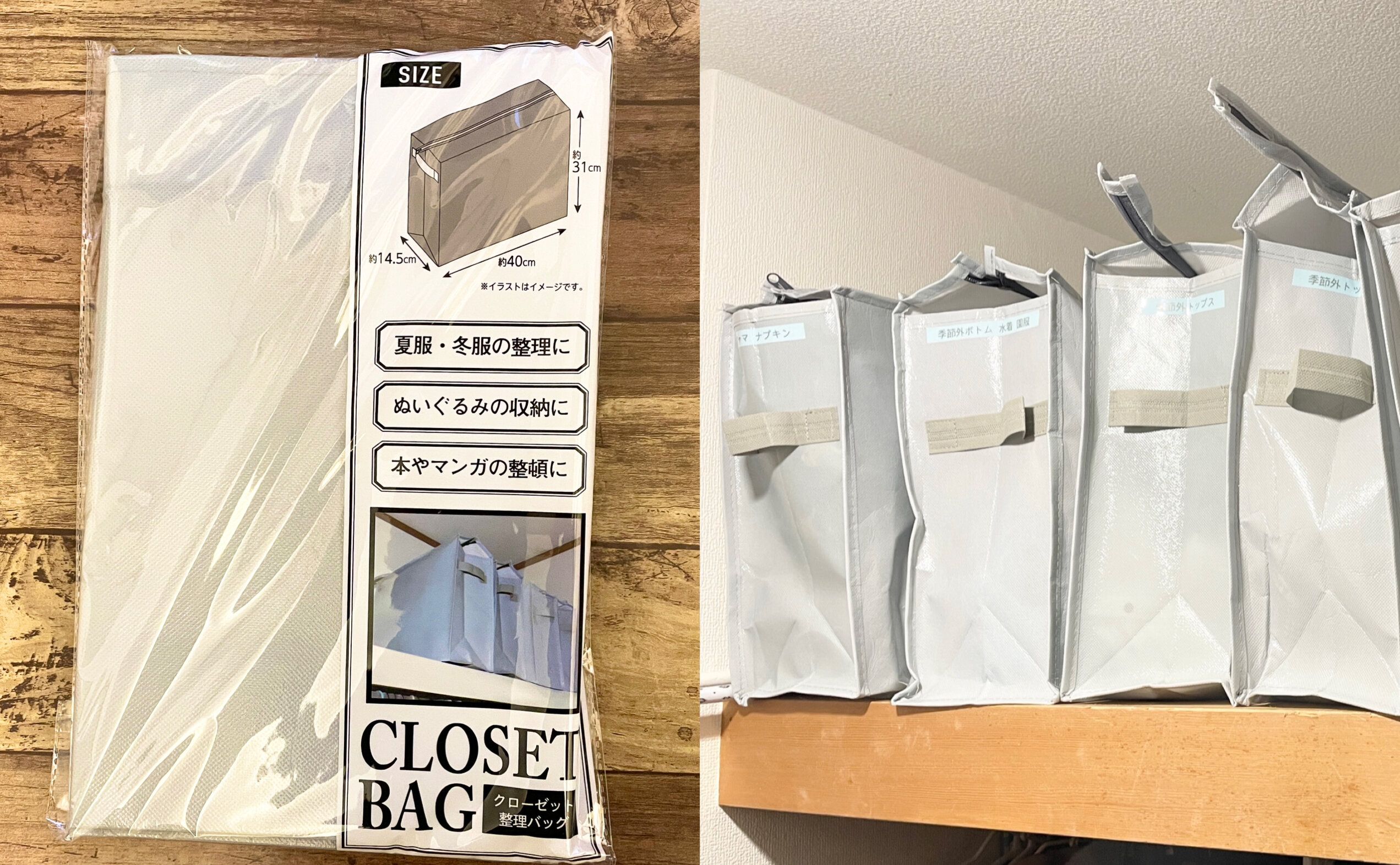 最初にご紹介するのは「クローゼット整理バッグ」です。約31cm×40cm×14.5cmのサイズのビニール製バッグ1つ入りで価格は110円。