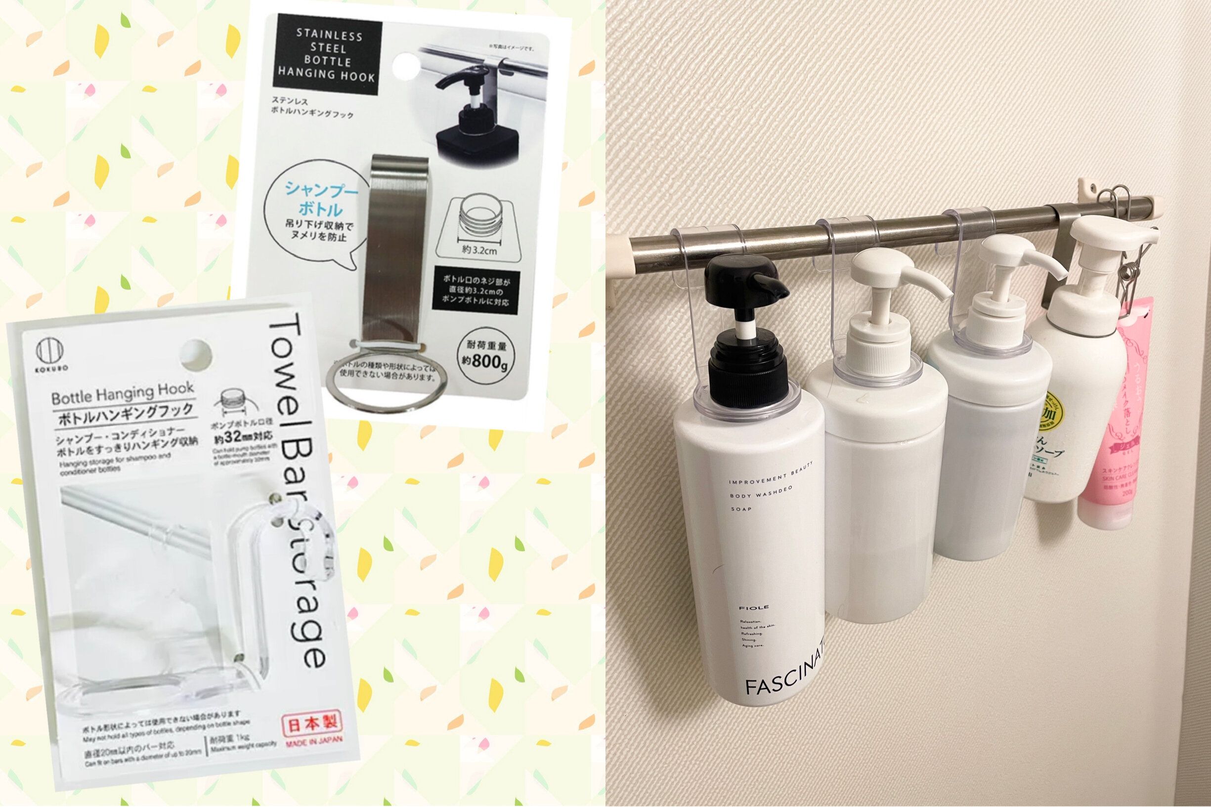 シャンプーやボディーソープのボトルに取りつければ、タオルバーなどにかけられる「浮かせる収納」がすぐに叶いますよ。