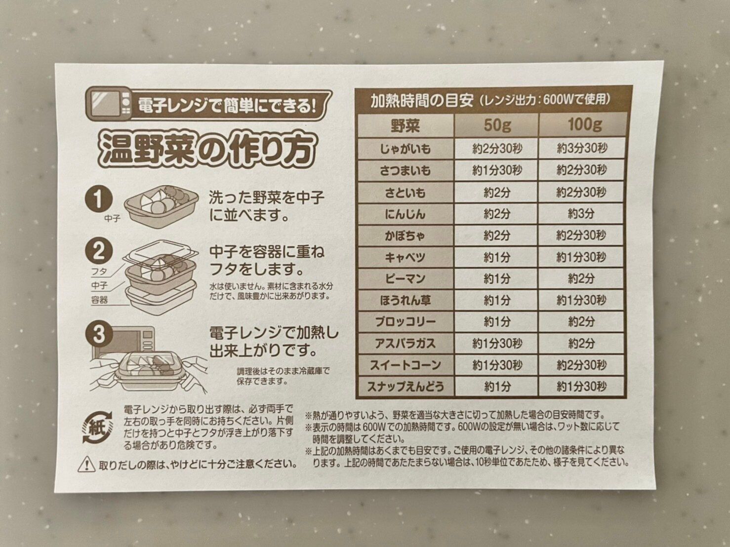 野菜の加熱時間の目安表がついてくる!