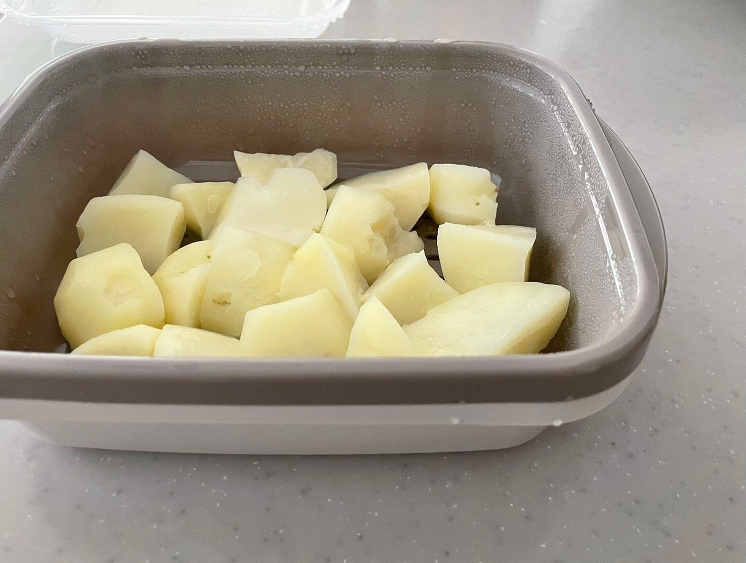 一口大にカットしたじゃがいもを加熱してみました。水でゆでる場合は野菜がくずれたり、ゆで汁に栄養が逃げてしまったりしますが、温野菜メーカーで調理した場合は、中身まで柔らかくホクホクしていて、形がくずれることなくできあがりました。