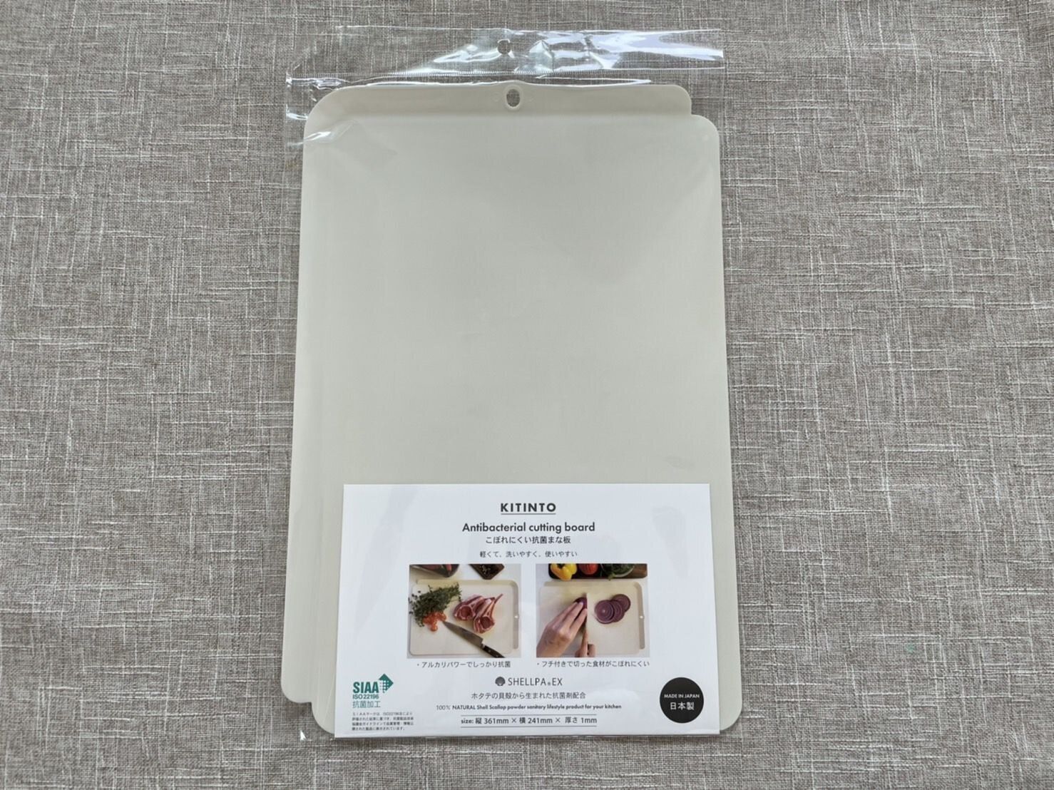 今回ご紹介するのは、デザイン性・機能性に優れた3COINSの「KITINTOこぼれにくい抗菌まな板」です。ホタテの貝殻から生まれたアルカリ性の抗菌剤が配合されており、抗菌製品技術協議会(SIAA)が指定した抗菌マークが認定されており、安心安全に使用できる商品です。