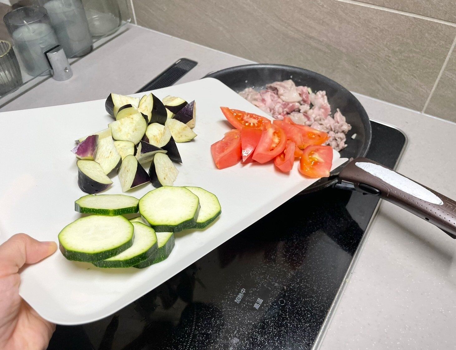 また板自体がとても軽いので、食材を乗せた状態でも片手で簡単に持ち上げられます。そのまま数種類の食材をこぼすことなく、フライパンに入れることができるので便利です。