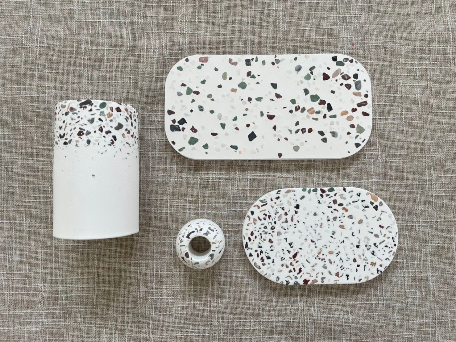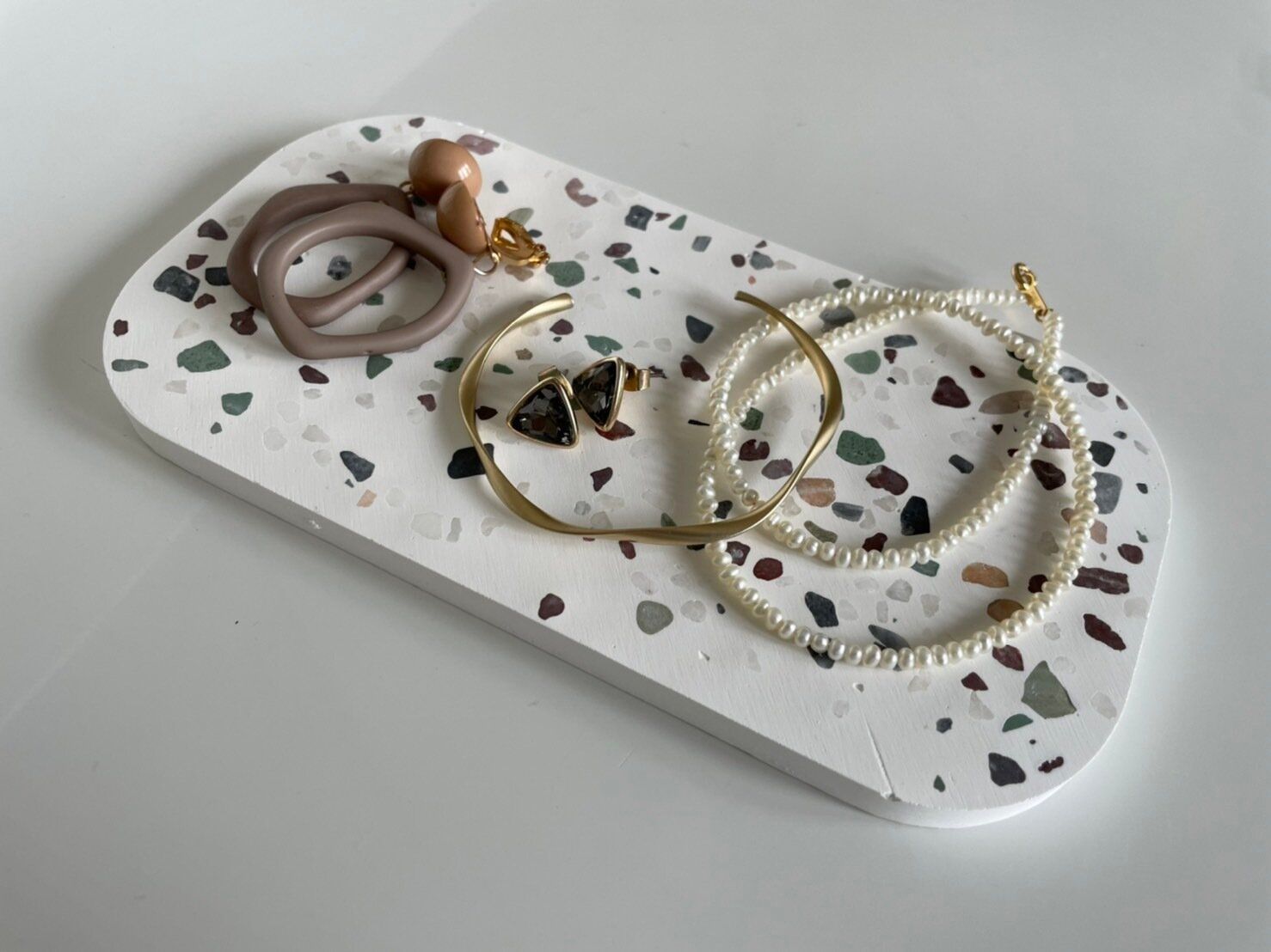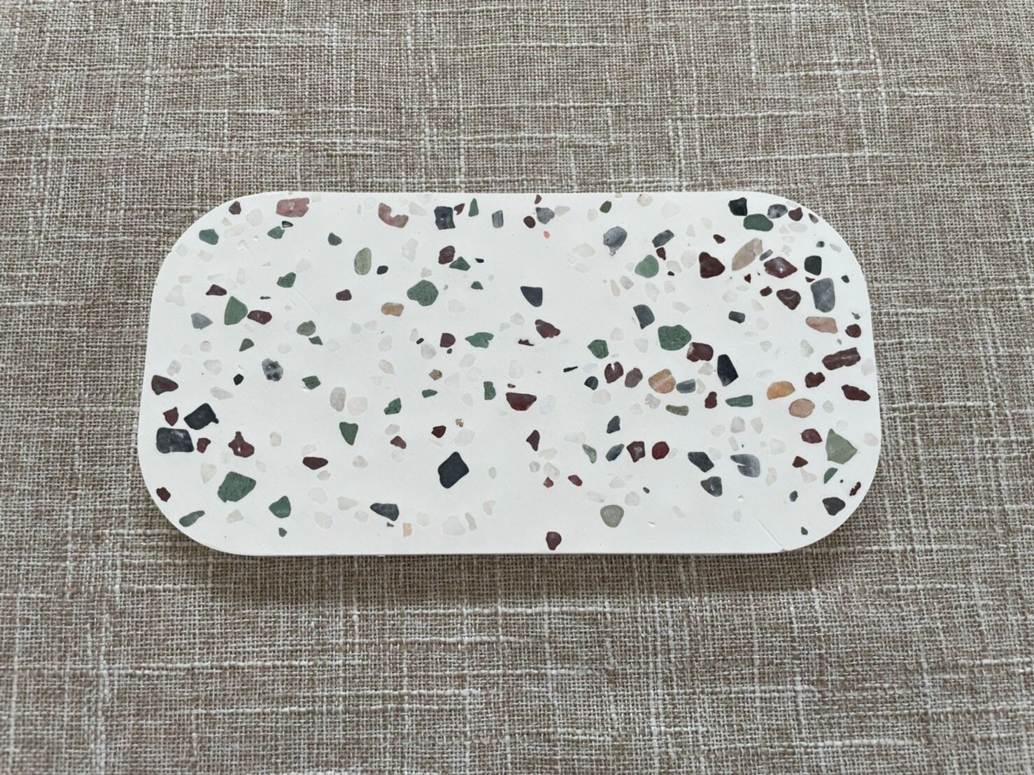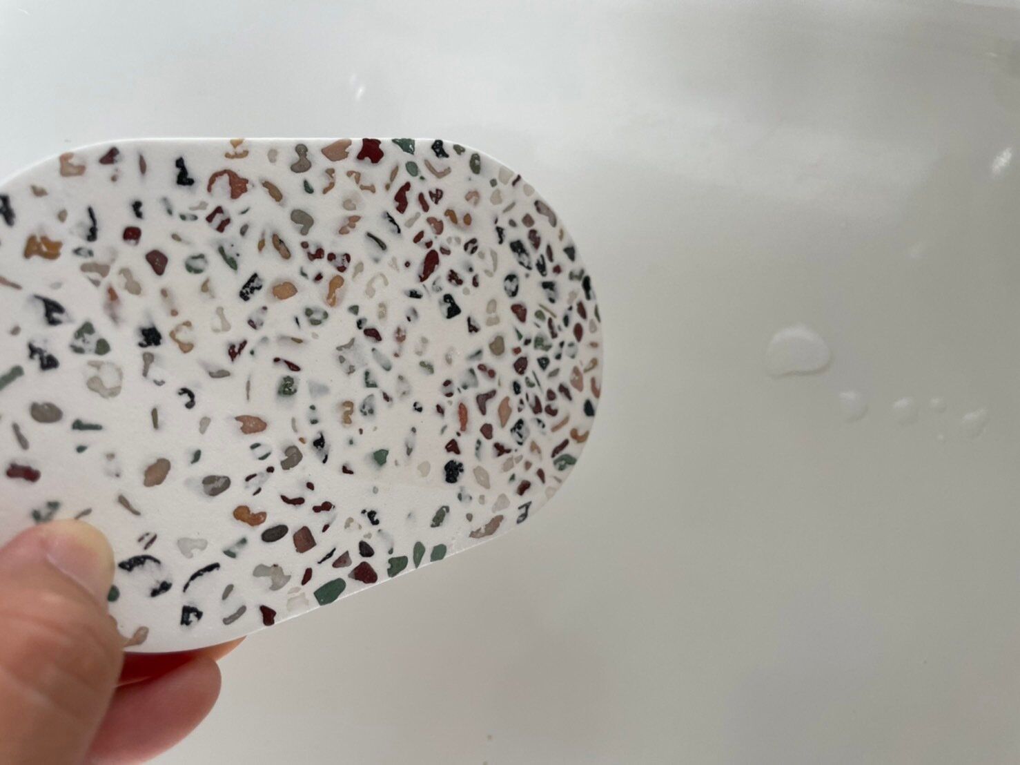 3COINSの珪藻土シリーズの特徴は、なんといってもデザイン性の高さ。天然石を埋め込まれたデザインのテラゾー模様がとても可愛いです。インテリアとしても幅広く使えます。