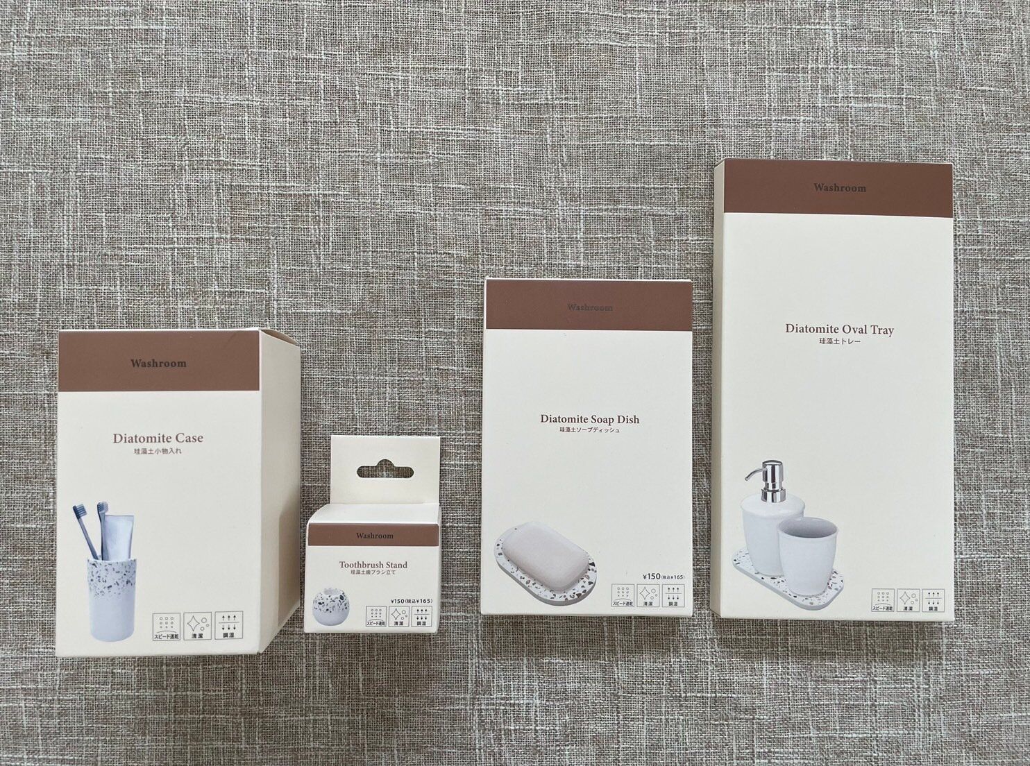 3COINSの珪藻土シリーズは4種類展開。吸水性・速乾性が良く、水回りでも大活躍なんだとか。デザイン性の高さからインテリアとしても幅広く活用できるそうです。