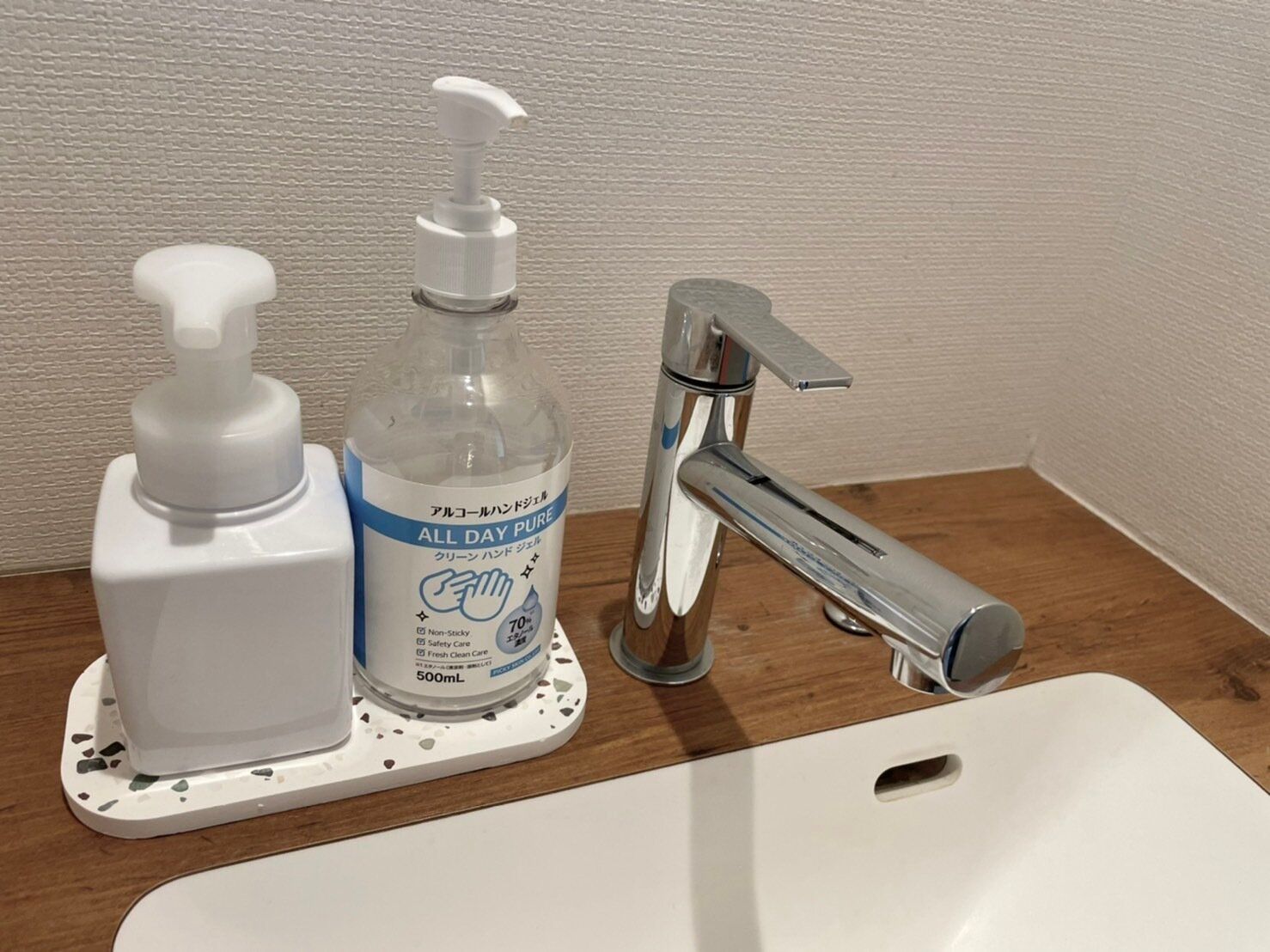 天板が木製などの洗面は、なるべく水に濡らしたくないですよね。珪藻土トレーを使ってハンドソープなどを置くと安心です。