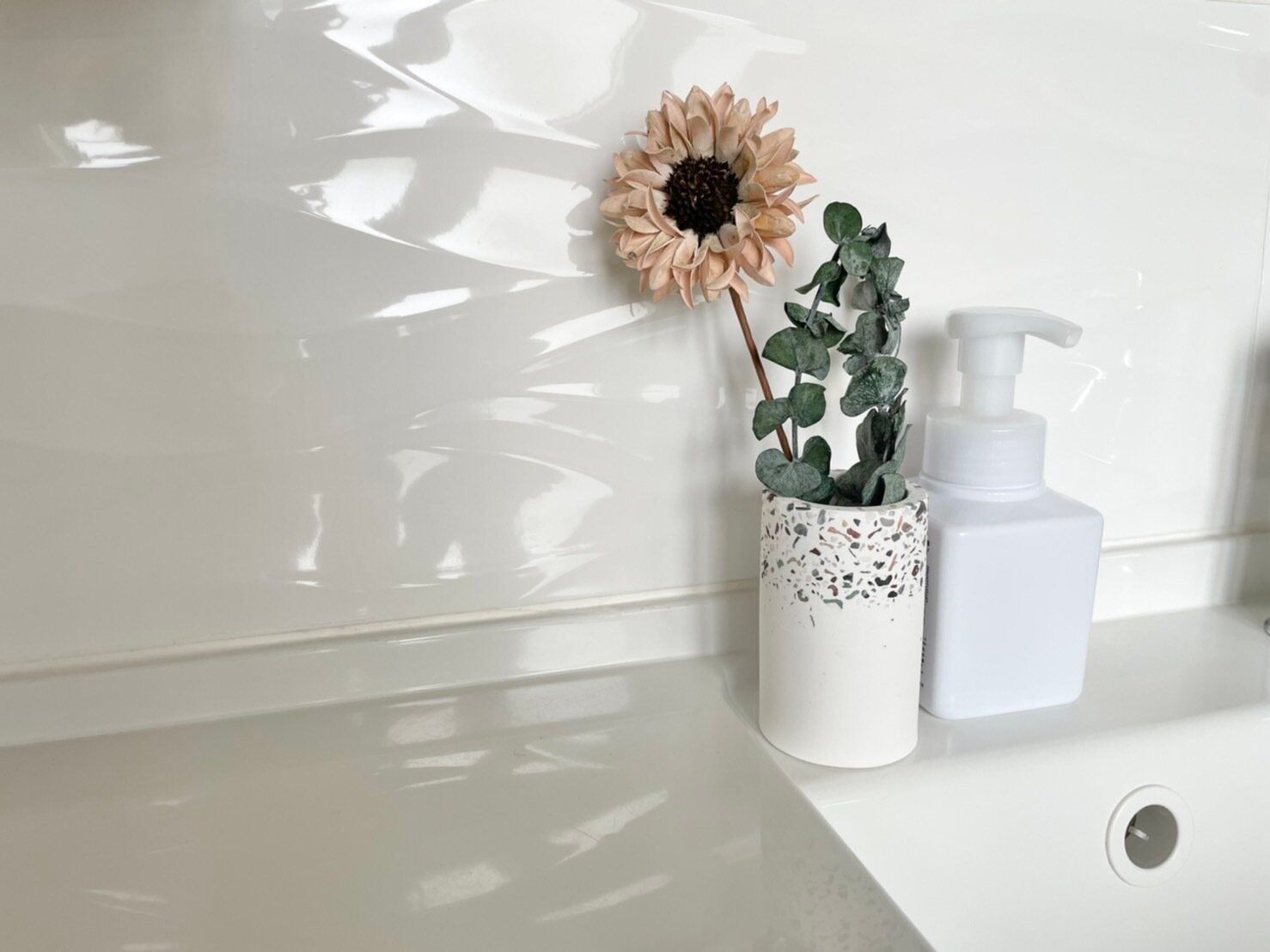 3COINSに販売しているドライフラワーをさしてみました。洗面まわりやキッチンに置くと華やかになります。