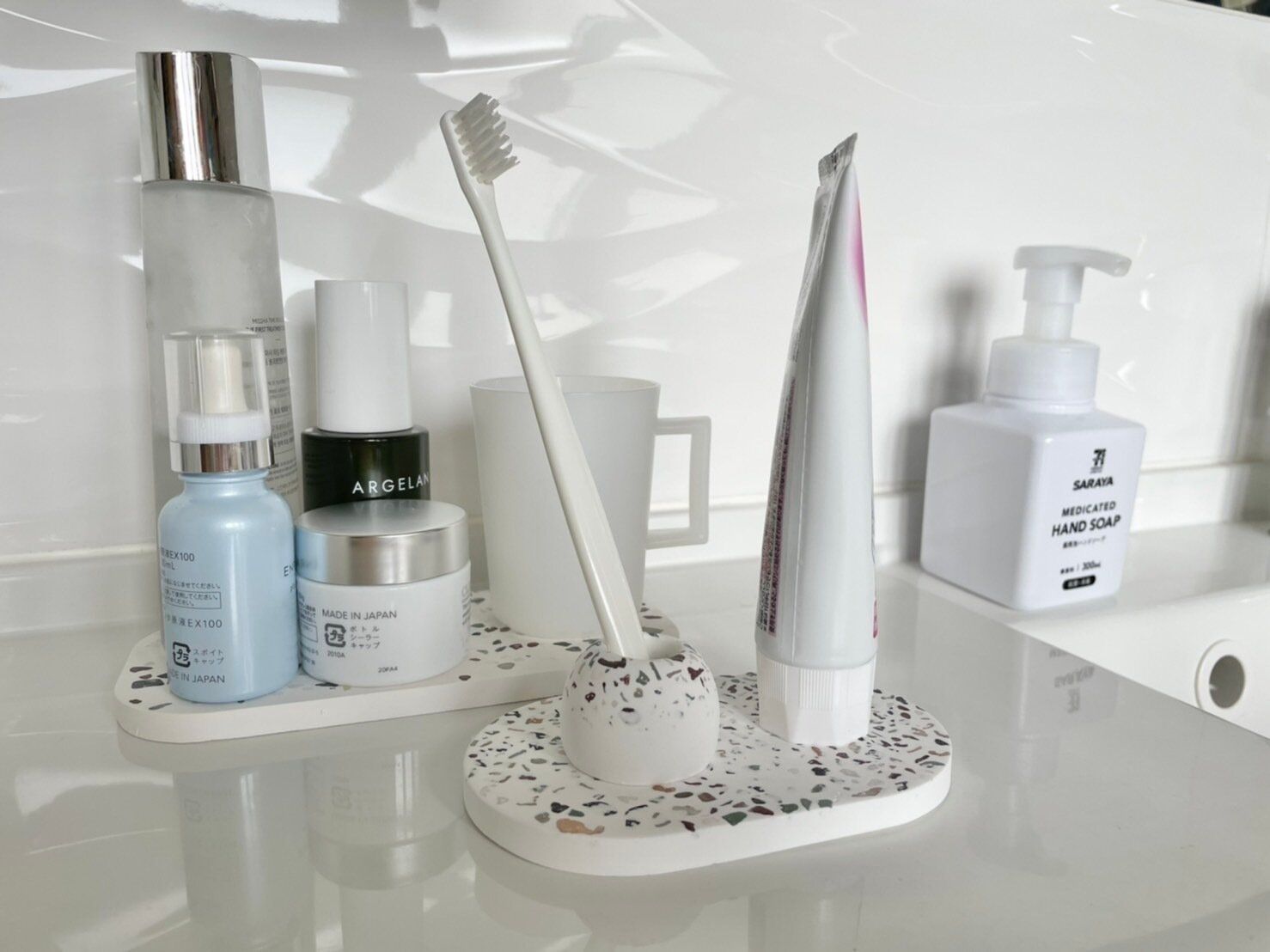 我が家ではソープディッシュの方に歯ブラシと歯磨き粉を置いて、トレーには化粧水などを置いています。