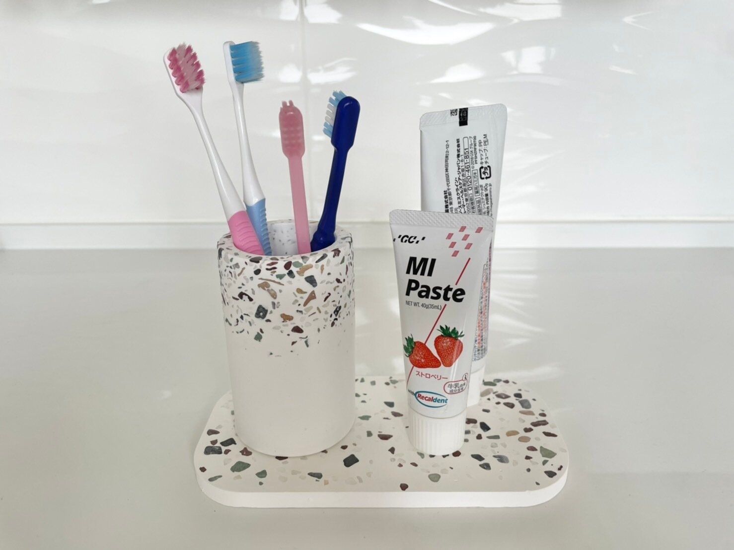 家族が多い時は、背の高い小物入れを利用して、歯ブラシを立てましょう。