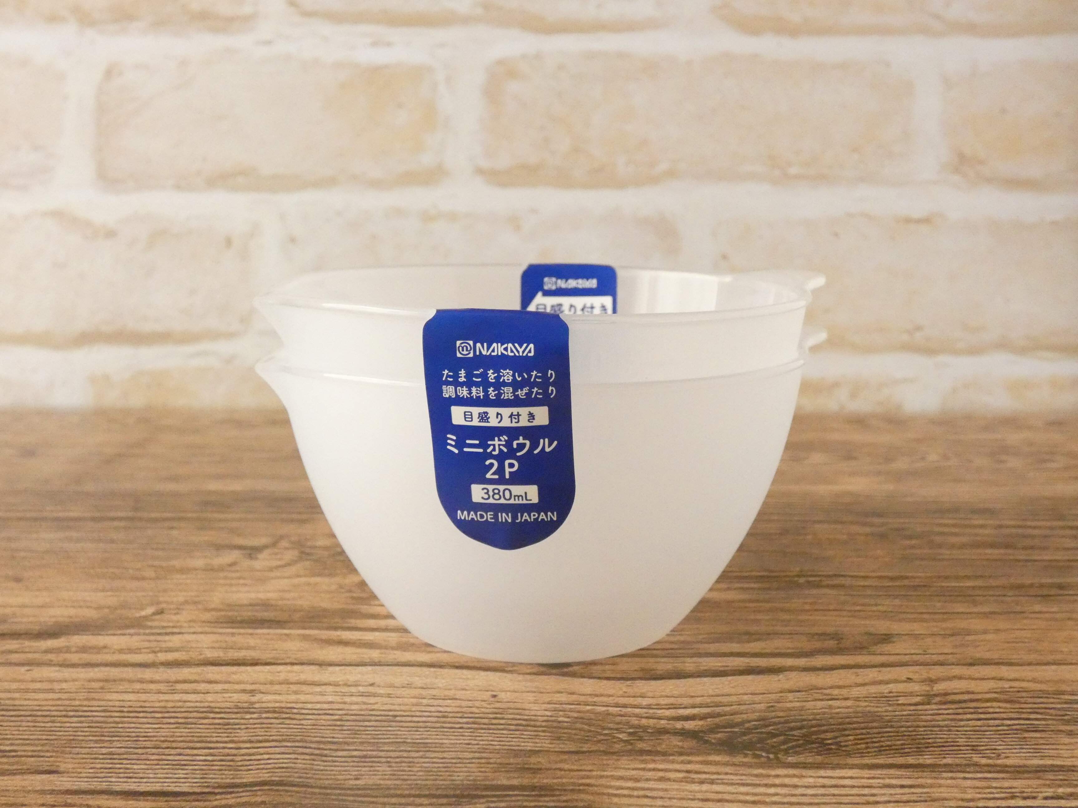 「目盛り付きミニボウル 2P」は110円。調味料を混ぜたり卵を溶いたりする半透明のボウルで、直径112mm、高さ63mm。