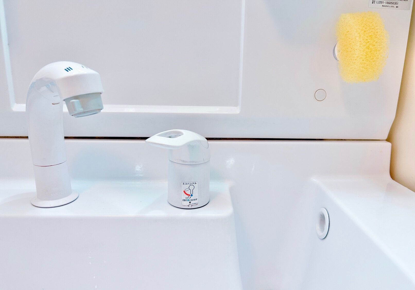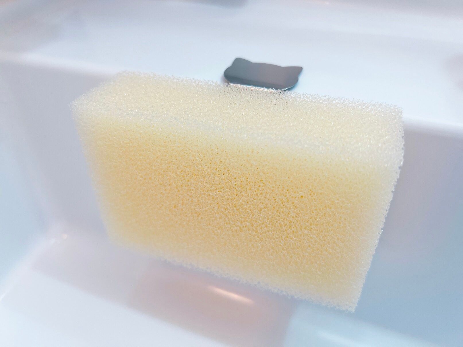 スポンジがドーンとあると目障りなので、小さくカットしたスポンジを洗面台の隅に目立たないように収納するとスッキリ見えますよ。