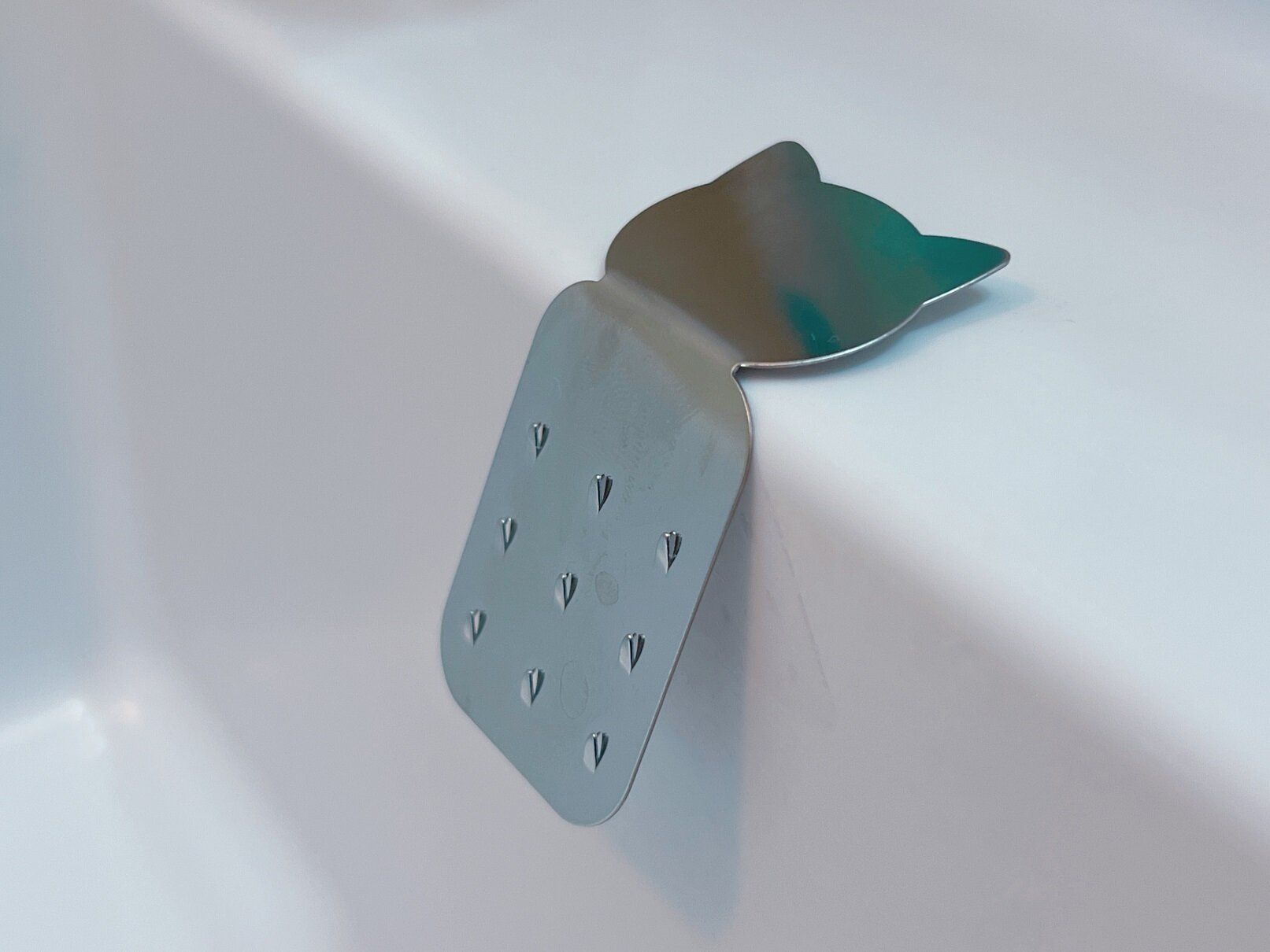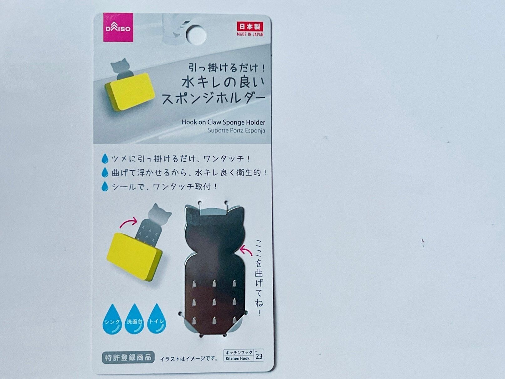 ネコの首部分を折り曲げて使います。シンクの壁から離して斜めに折るのがポイントです。シンクとの隙間に水カビも発生しにくく、スポンジの水切れもよくなります。