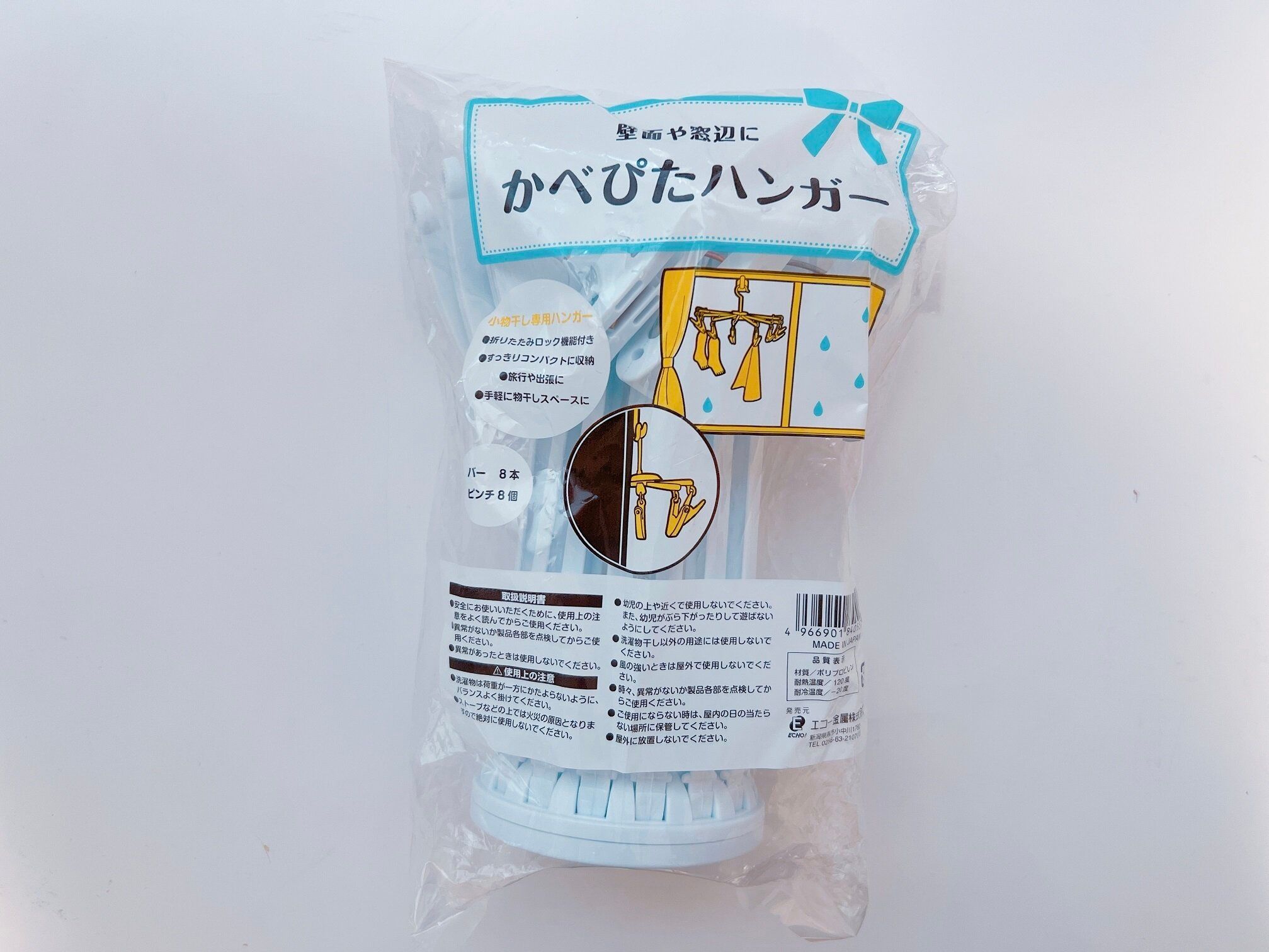 「かべぴたハンガー」はアームが8本、ピンチが8個ついています。折りたたみロック機能がついているので、アームもカチッと止まりバラバラと落ちてくることはありません。