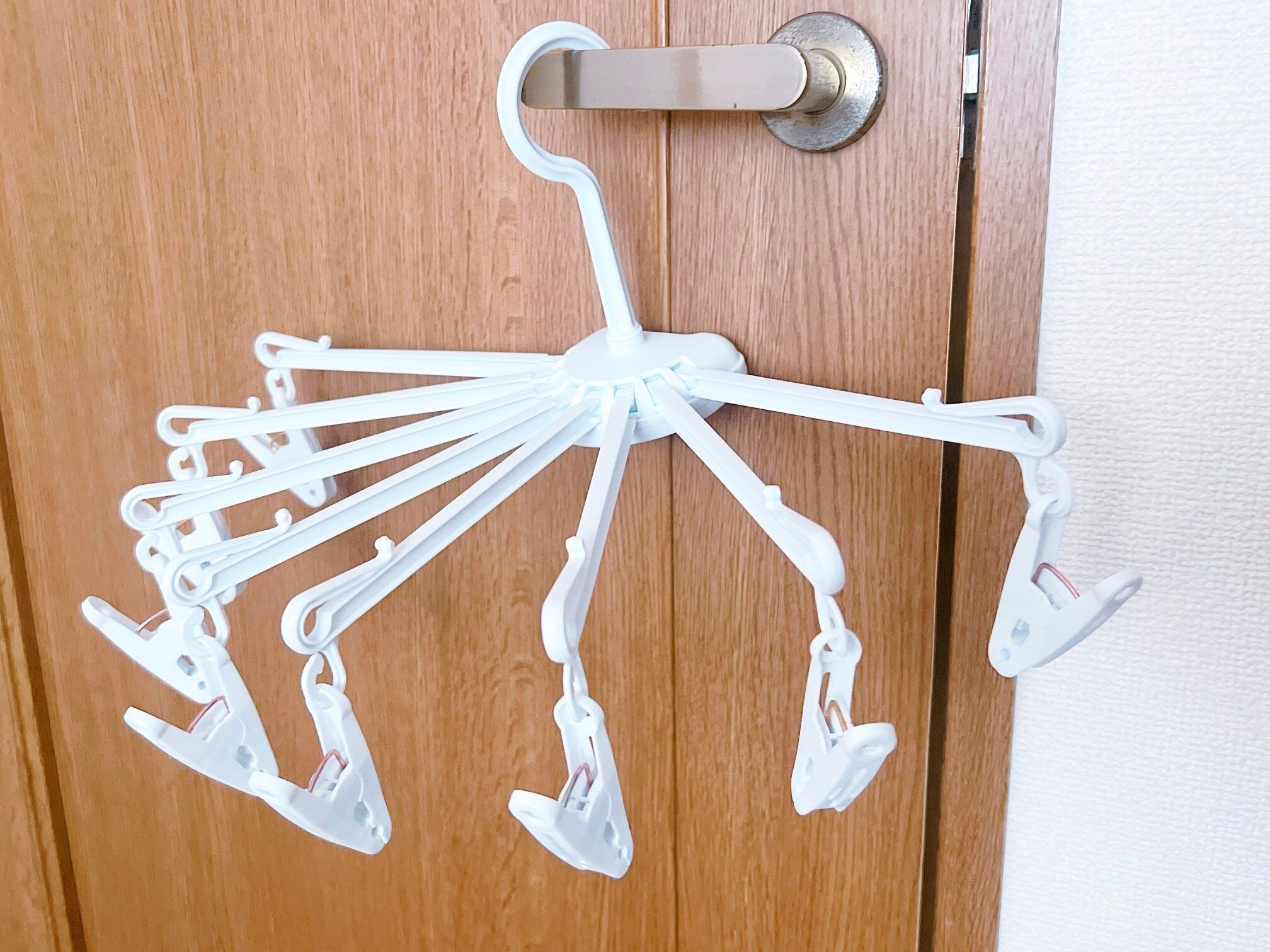 窓辺だけでなく、ドアノブや椅子の背もたれなど引っ掛けられる所があれば、手軽に物干しスペースになっちゃいます。