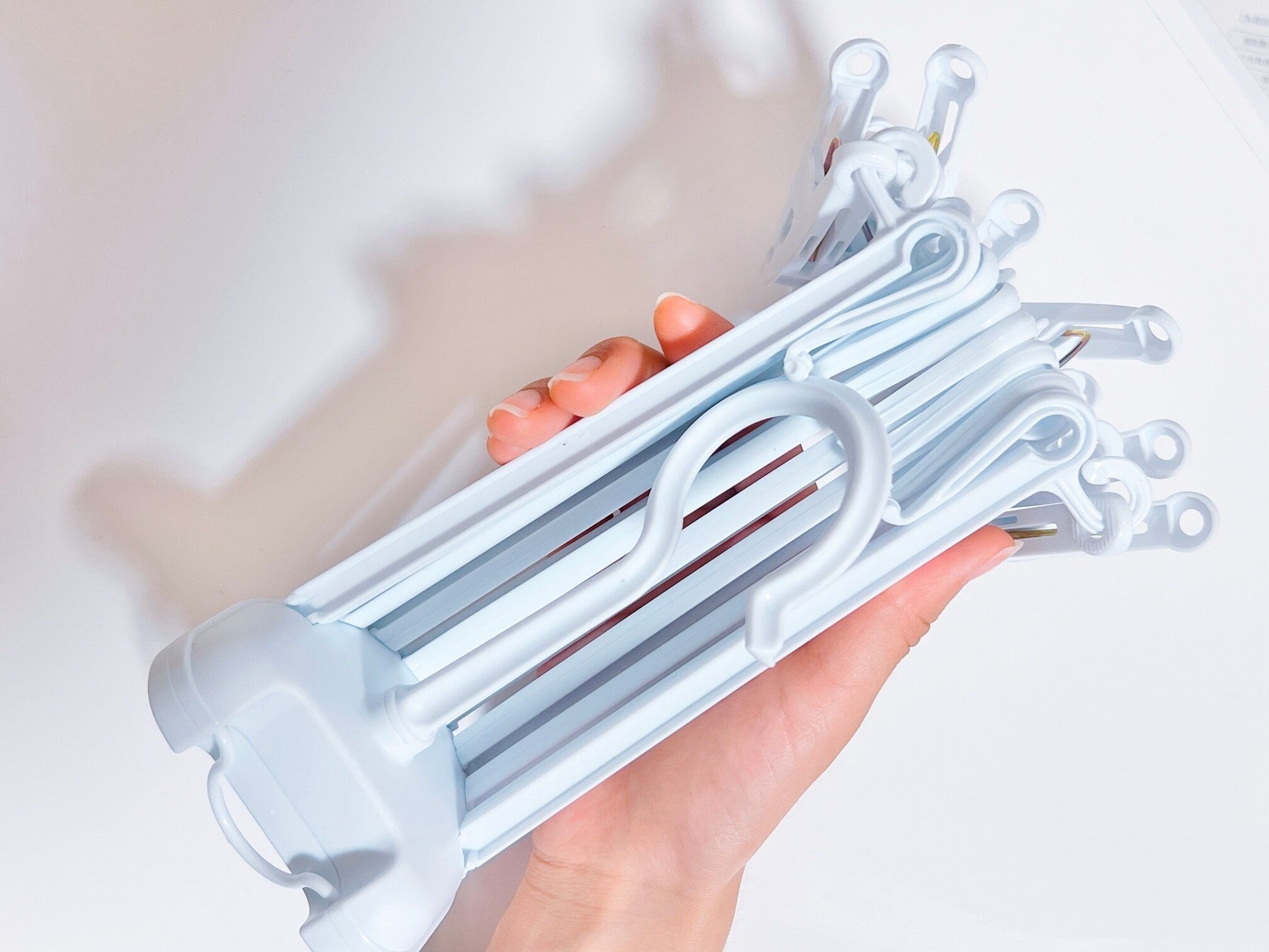 アームの長さは約17cm。片手で持てるほどにコンパクトなので、スーツケースに入れても邪魔になりません。旅行や出張先のホテルで備え付けのハンガーでは足りない場合や、下着や靴下を洗濯したときにも便利です。