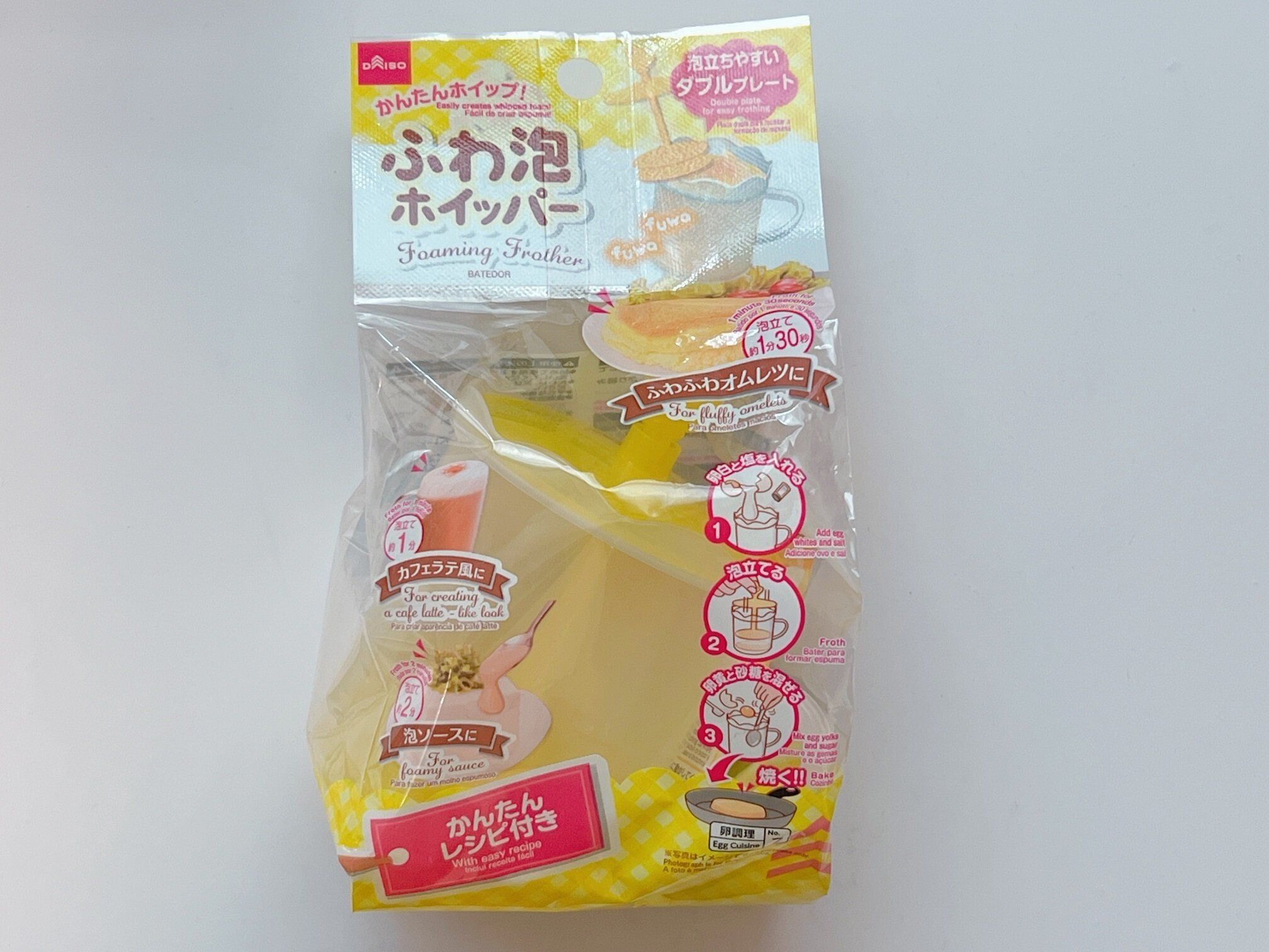 今回ご紹介するのは、ダイソーの「ふわ泡ホイッパー」(110円)。かんたんレシピ集もついています。コップほどの大きさなので、パッと取り出せて、サッと片づけられます。
