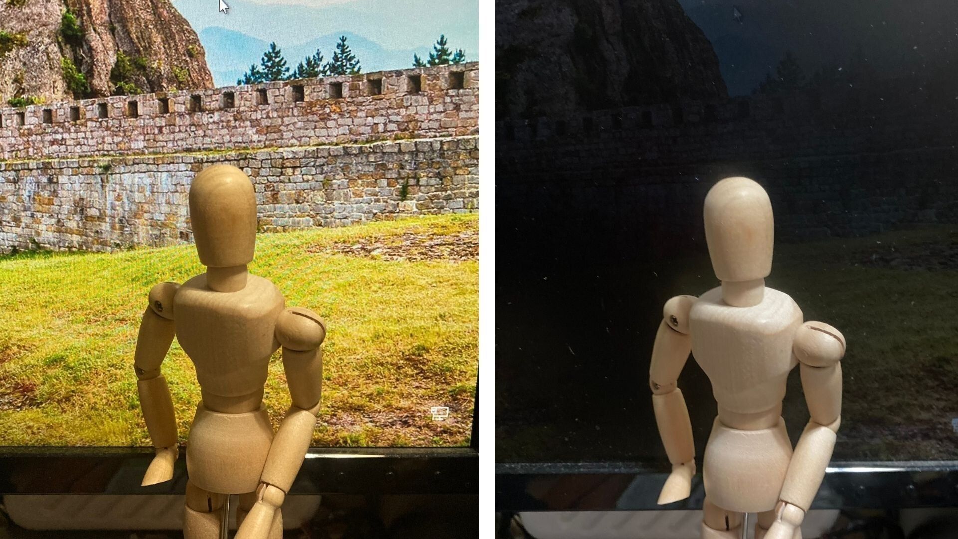 上の写真は、人形の背景にパソコン画面を表示した状態で偏光フィルターを使って撮影したもの。左がフィルターなしで、右がフィルターありです。偏光フィルターがあると、パソコン画面だけが真っ暗になっているのがわかりますよね。