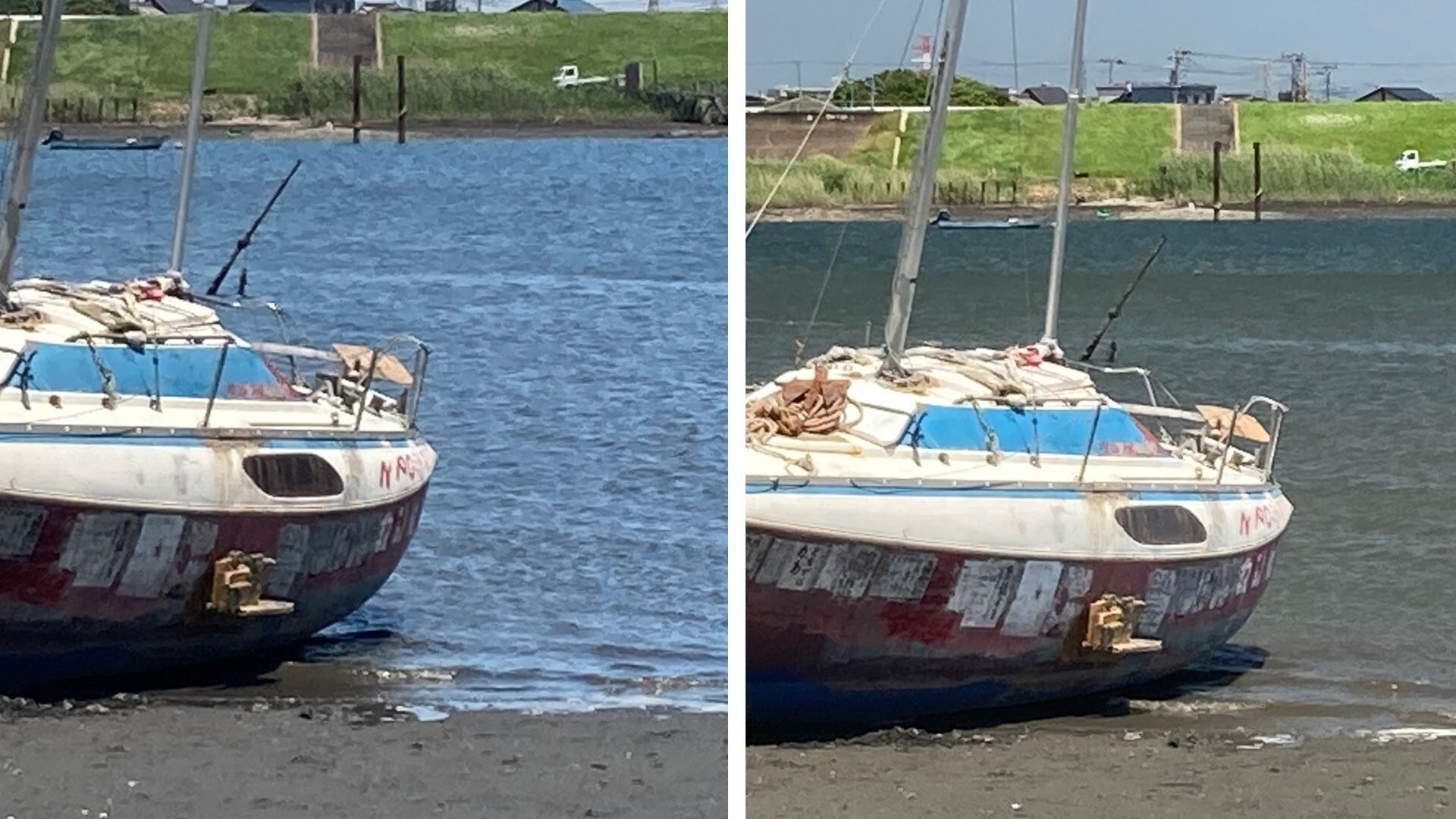 続いては、偏光フィルターを使って、川の写真を撮影してみたものです。左がフィルターなし、右がフィルターありです。