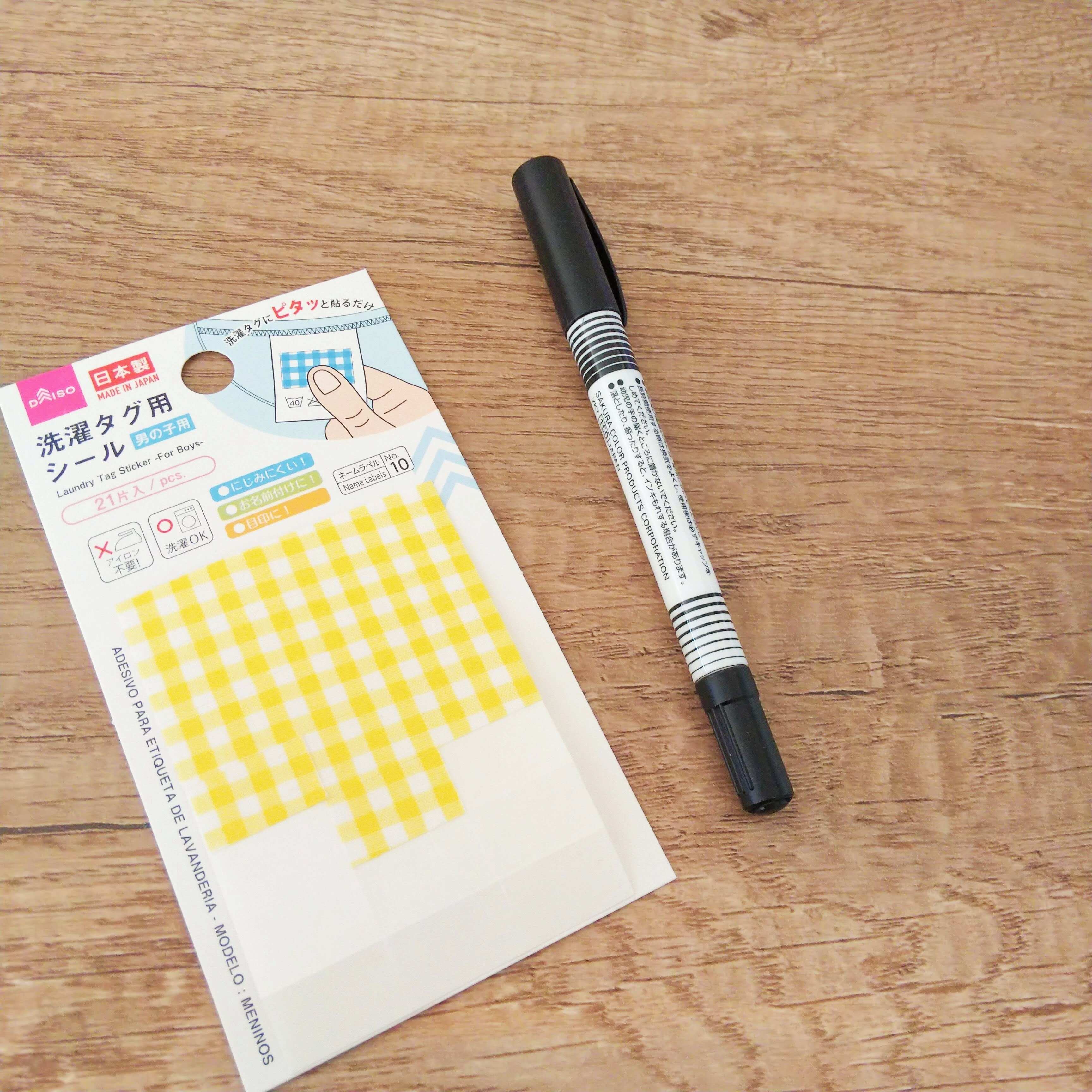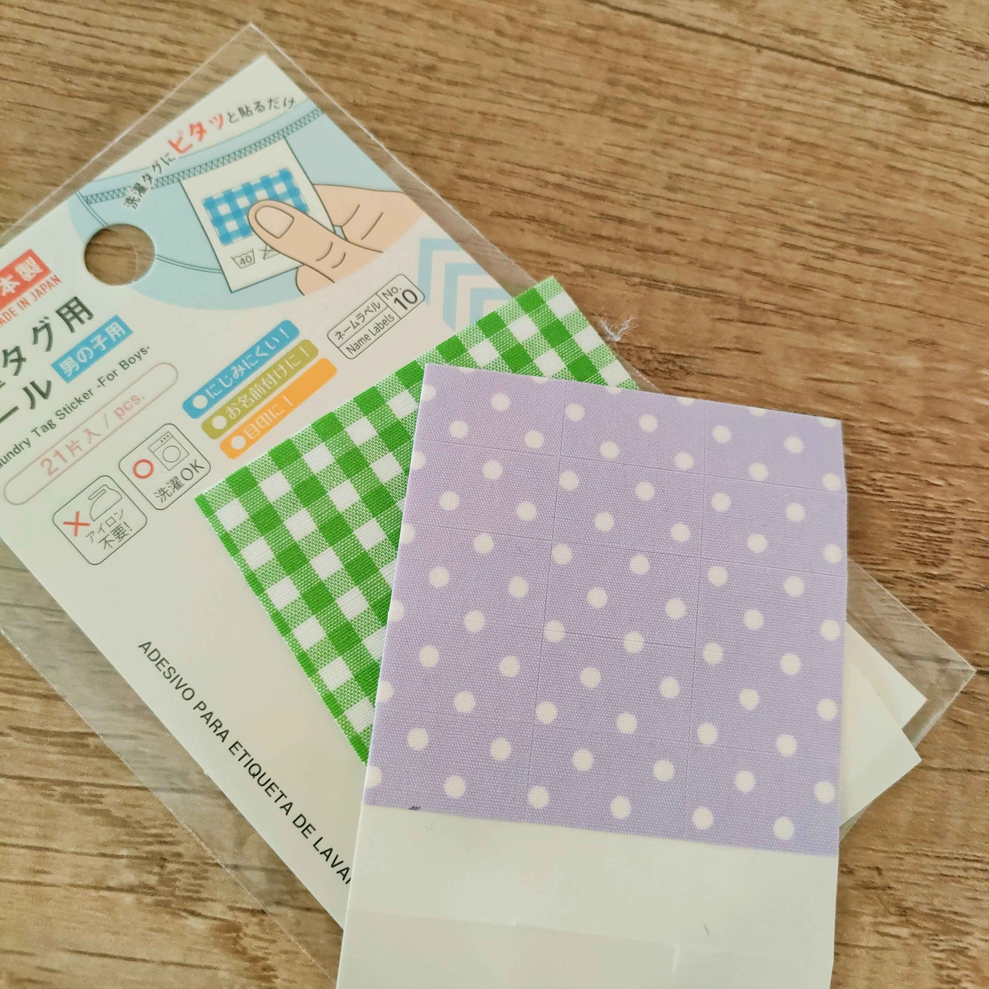 使い方は簡単!こちらのタグ用シールに油性ペンで名前を書いて、洋服のタグに貼り付けるだけ!アイロンも刺繍も要りません。それなのに、洗濯もできるし、にじまないのです!