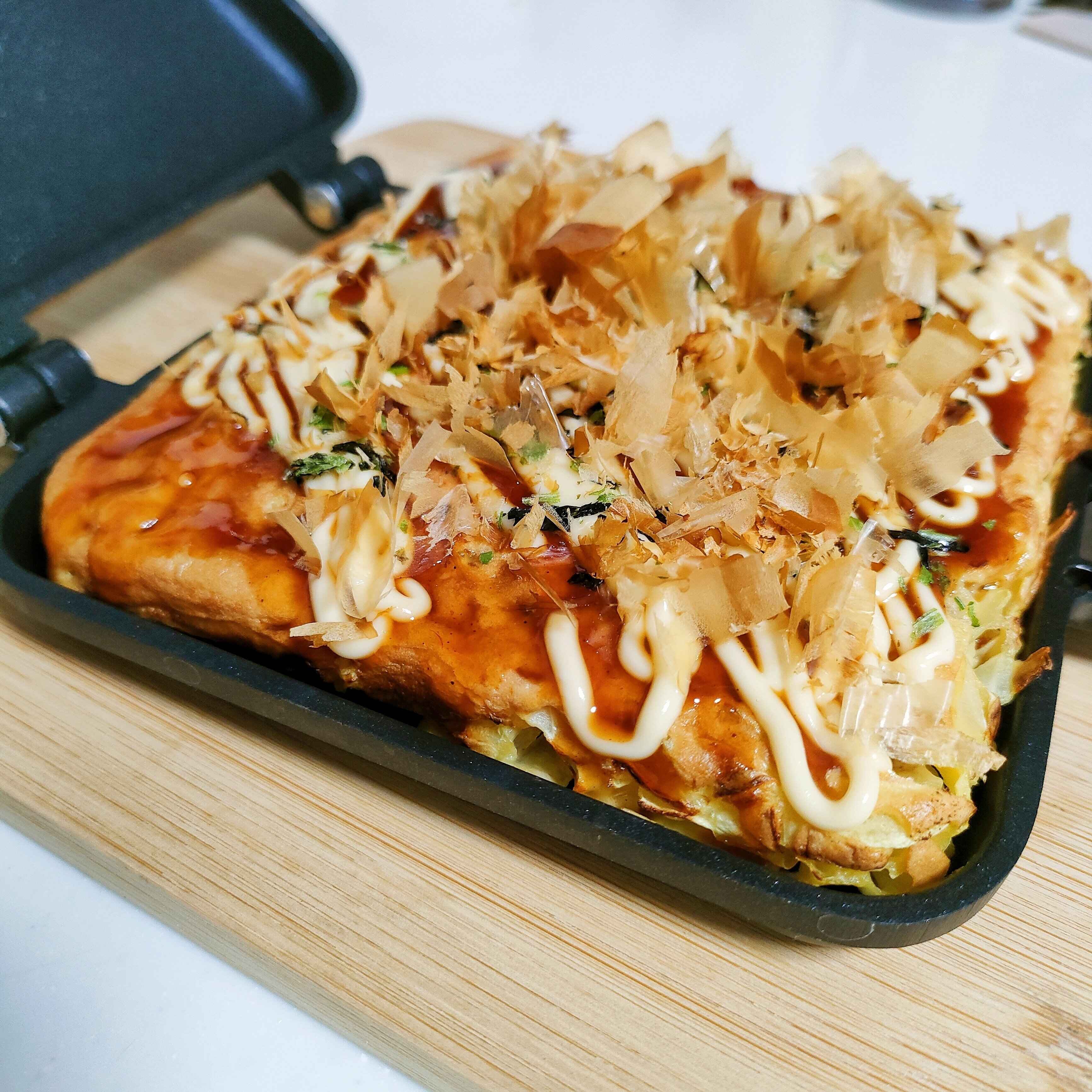 四角のかわいらしいお好み焼きができあがりました!中に火が通り、ふわふわと食感が軽いお好み焼きになりますよ。