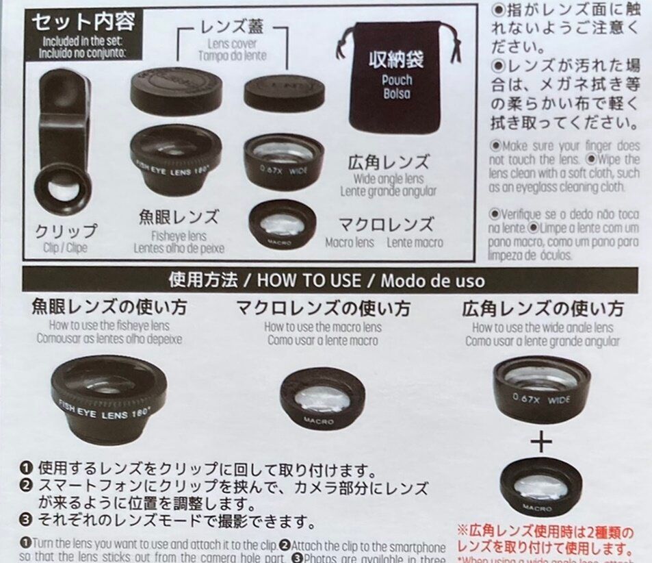 箱から取り出したときに「あれ?レンズが2つしかないぞ」と思ったのですが、説明書をよく読むと、小さいほうのレンズは、広角レンズはマクロレンズの上に重ねて使うようで、2つのレンズが重なって収納されていました。